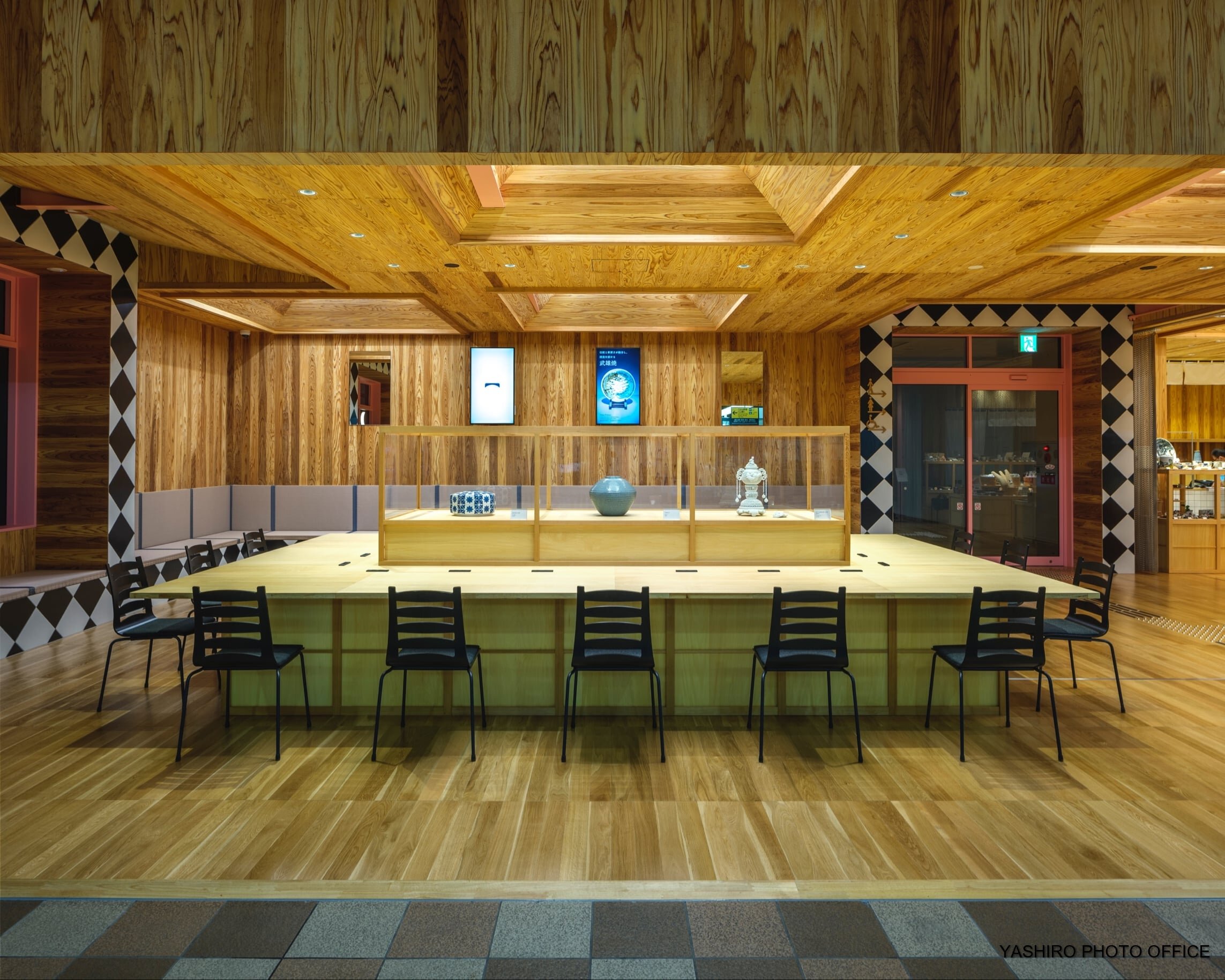 入口の暖簾をくぐると、江戸時代中期、領主・武雄鍋島氏の専用風呂として造られた総大理石の見事な風呂「武雄温泉 殿様湯」の市松模様を継承したデザインの内装に、風呂桶などを活用して商品を並べるなど、温泉の街である武雄市の窓口として、観光客の皆様をお迎えいたします。
