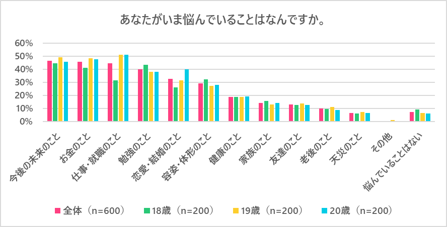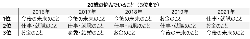 20歳では1位「仕事・就職のこと」 2位「お金のこと」 3位「今後の未来のこと」