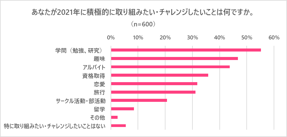 続いて、2021年に積極的に取り組みたい・チャレンジしたいことは何であるかを複数選択で聞いたところ、半数以上の人が「学問」(55.2%)を選択し、若者らしい回答が1位となりました。続いて2位は「趣味」(46.7%)、3位は「アルバイト」(43.7%)、4位は「資格取得」(35.8%)、5位は「恋愛」(31.8%)となりました。この結果を性年齢別に見てみると、18~19歳の女性は半数以上が「アルバイト」を挙げる一方で、同年齢の男性は4割弱にとどまっており、男女でアルバイトへの熱の入れようが異なることが分かりました。また年齢が上がるにつれて「資格取得」への意向が高い傾向となり、学生気分から徐々に就職を意識していることが見てとれる結果となりました。