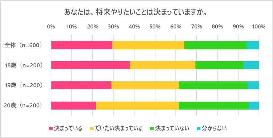 コロナ禍で将来への不安が高まる中、将来やりたいことが決まっているかどうかを聞いたところ、「決まっている」「だいたい決まっている」を回答した人は6割となりました。この結果を年齢別に見てみると、年齢が上がるごとに将来やりたいことへの道筋が現実化してくることもあってか、18歳は7割、19歳および20歳は6割が「決まっている」「だいたい決まっている」との結果となりました。