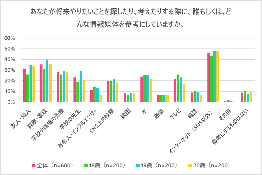 将来やりたいことを探したり、考えたりする際に、誰もしくは、どんな情報媒体を参考しているかを複数選択で聞いたところ、1位は「インターネット(SNS以外)」(46.3%)、2位は「両親・家族」(35.3%)、3位は「友人・知人」(31.5%)、4位は「学校や職場の先輩」(28.0%)、5位は「本」(24.0%)となり、将来を考える際には自分の身近にいる人に相談をしたり、インターネットや本で調べていることが分かりました。この結果を年齢別に見てみると、18歳および19歳では「有名人・インフルエンサー」「テレビ」との回答が20歳よりも多く挙げられ、年齢が低いほど将来やりたいことをより理想的な視点で捉えていることが見てとれました。