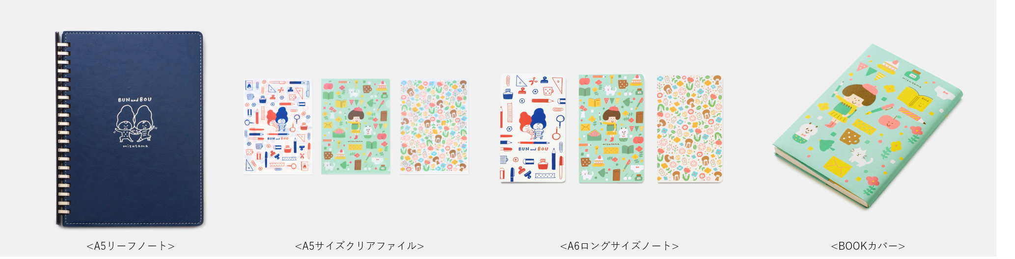 mizutama×TSUTAYAオリジナル文房具は、高級感が感じられるPUレザーの表紙に銀箔押しのmizutamaによるイラストが施された「A5リーフノート」をはじめ、心があたたまるかわいらしいイラストで、女性の鞄にも入れやすいコンパクトな「A5サイズクリアファイル」や、持ちやすいサイズでポケットにも入れやすい薄型の「A6ロングサイズノート」を取り揃えています。