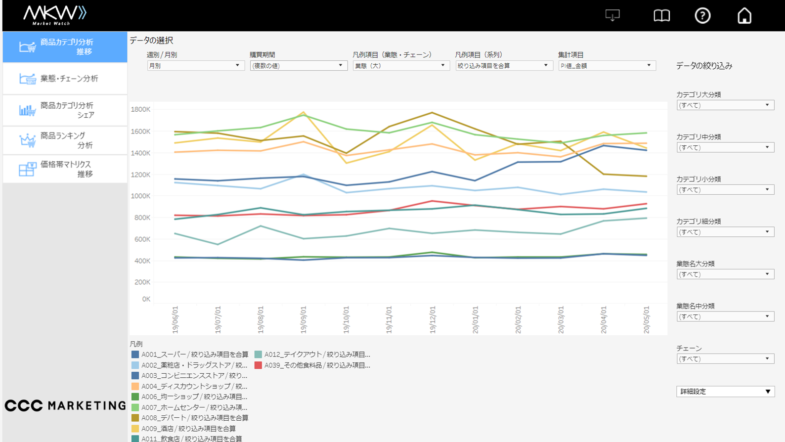 「Market Watch」は、年間50億件超におよぶ購買データと7,000万人を超える生活者のライフスタイルデータを統合したデータベースに加えて、マーケティングに資する複数のデータとも連携をしながら、さまざまな手法でデータを分析・可視化し、より幅広いマーケティングをサポートするサービスです。CCCマーケティングでは、テレビ視聴データと購買データを中心にテレビCM出稿を評価したり、性年代にとらわれないあらゆる切り口でテレビの視聴時間帯や人気番組(録画含む)のランキングメニューを分析できる「Market Watch TV版」を提供しています。
