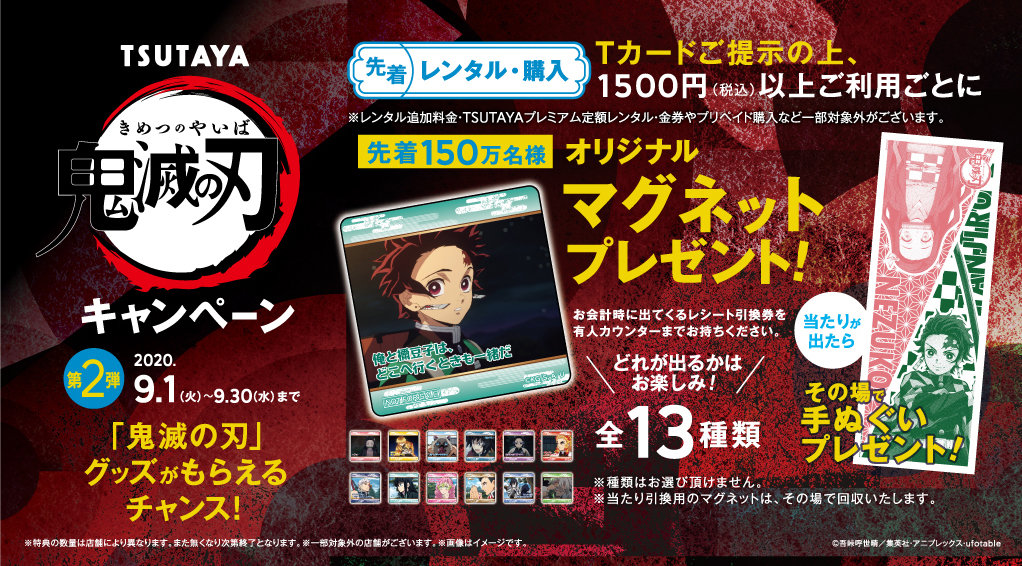 同一店舗かつ同一日の、レンタル・ご購入利用お会計額が合計1,500円以上(税込)ごと、先着150万名様にTVアニメ『鬼滅の刃』オリジナルマグネットをプレゼント(ランダムお渡し)、もし「当たり」マグネットが出た場合は「当たり」マグネットと引き換えに手ぬぐいをプレゼントいたします。