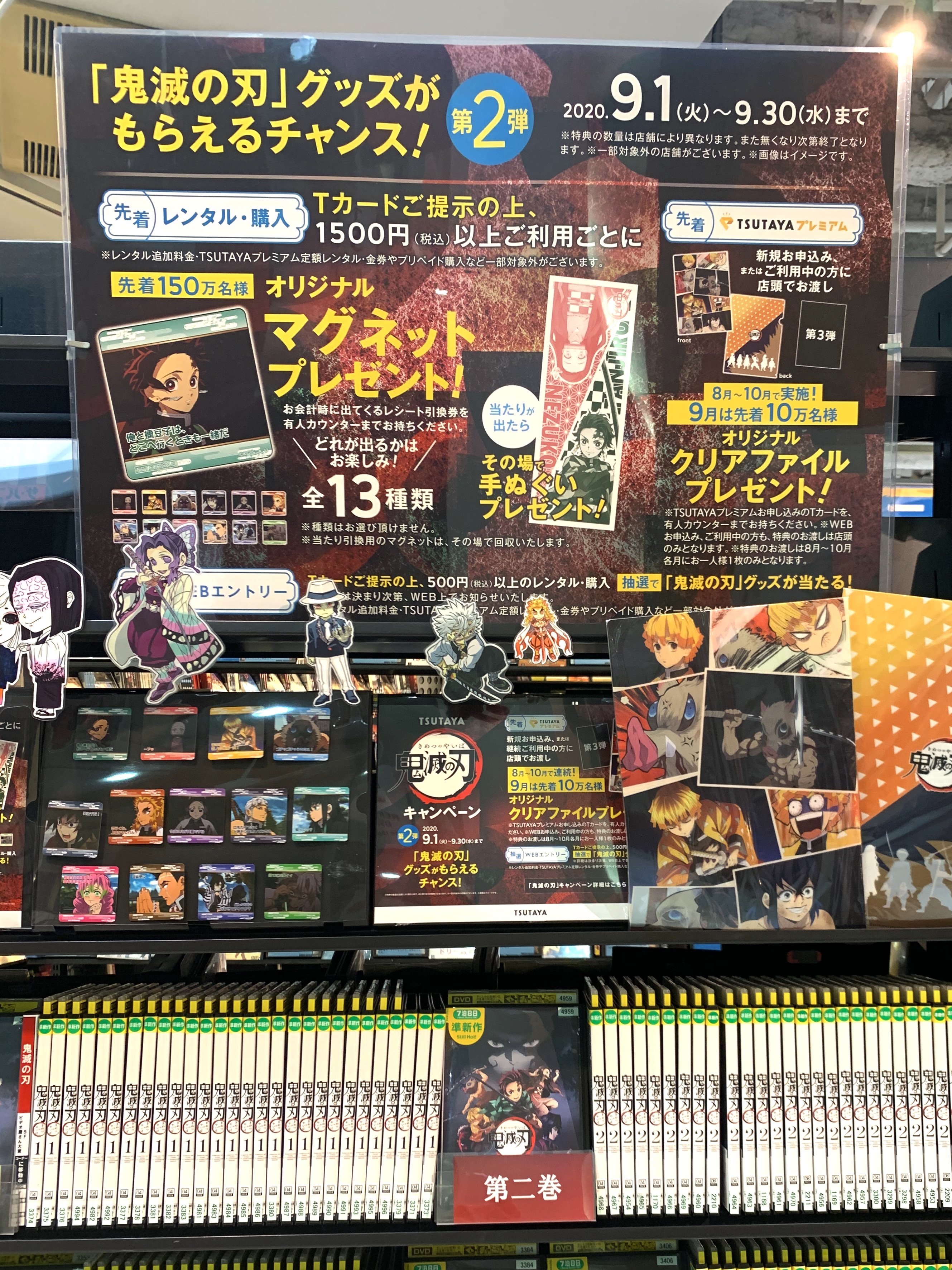 Tカードご提示の上、同一店舗かつ同一日の、レンタル・ご購入利用お会計額が合計1,500円以上(税込)ごと、先着150万名様にTVアニメ『鬼滅の刃』オリジナルマグネットをプレゼント(ランダムお渡し)、もし「当たり」マグネットが出た場合は「当たり」マグネットと引き換えに手ぬぐいをプレゼントいたします。