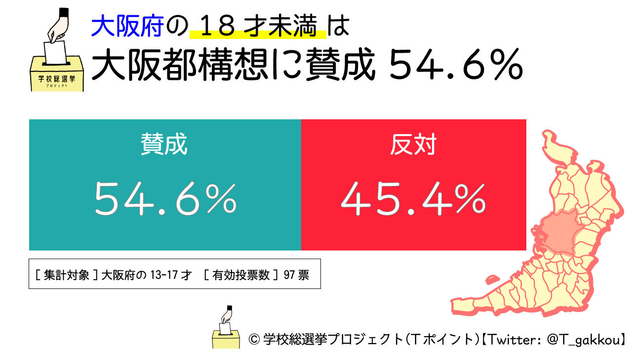 大阪在住の18歳未満の若者世代は大阪都構想に「賛成」が54.6%、「反対」が45.4% ~中高生から20代の若者世代と政治・社会をつなぐ「学校総選挙プロジェクト」~