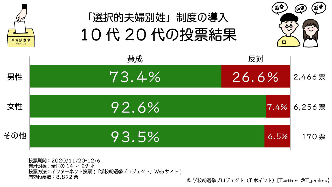「学校総選挙プロジェクト」では、2020年11月20日(金)~12月6日(日)までの間、オンライン投票によって「選択的夫婦別姓制度の導入」を募ったところ、全国の14~29歳男女から8,892票の投票をいただきました。