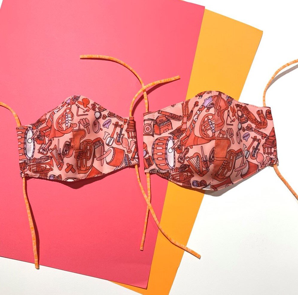同系色でまとめた楽器をモチーフにしたデザインです。 今にもハーモニーが聞こえてきそうなこのマスクは、 音楽の力を私たちに与えてくれます。