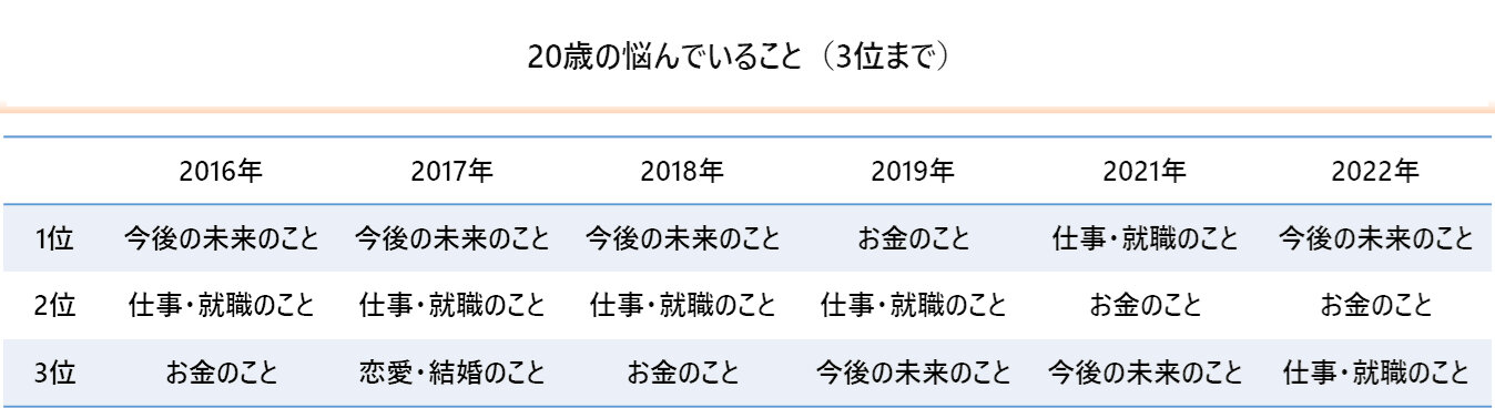 回答者を20歳に絞って2016年から経年※比較をしてみると、2016年では1位が「今後の未来のこと」、2017年では「今後の未来のこと」、2018年では「今後の未来のこと」、2019年では「お金のこと」、2021年では「仕事・就職のこと」となり、2022年では再び「今後未来のこと」が1位に浮上する結果となりました。