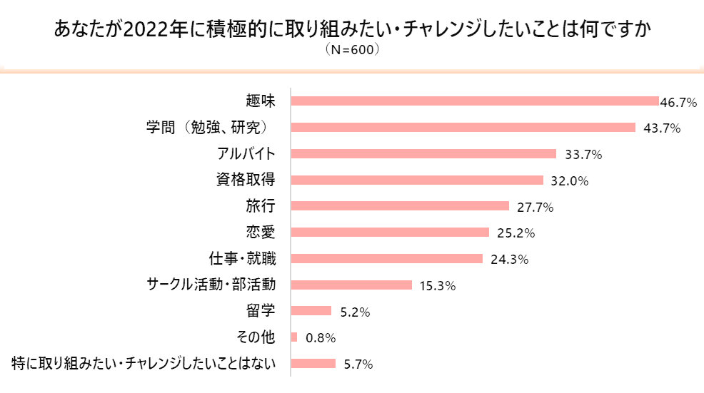 続いて、2022年に積極的に取り組みたい・チャレンジしたいことは何であるかを複数選択で聞いたところ、1位は「趣味」(46.7%)、2位は「学問」(43.7%)、3位は「アルバイト」(33.7%)、4位は「資格取得」(32.0%)、5位は「旅行」(27.7%)となりました。この結果を昨年と比較してに見てみると、上位3つに大きな変動はないものの、昨年は2位だった「趣味」が今年は逆転の1位となり、コロナ禍での若者のプライベートをより重視する傾向が強くなっていることが見て取れました。