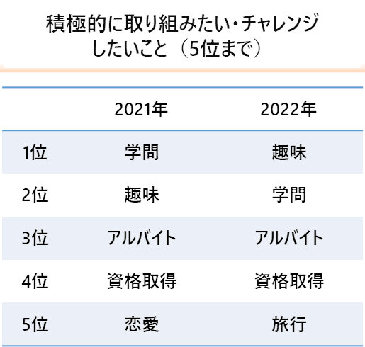 ●2022年に積極的に取り組みたいことは?今年は学問より趣味!1位「趣味」 2位「学問」 3位「アルバイト」