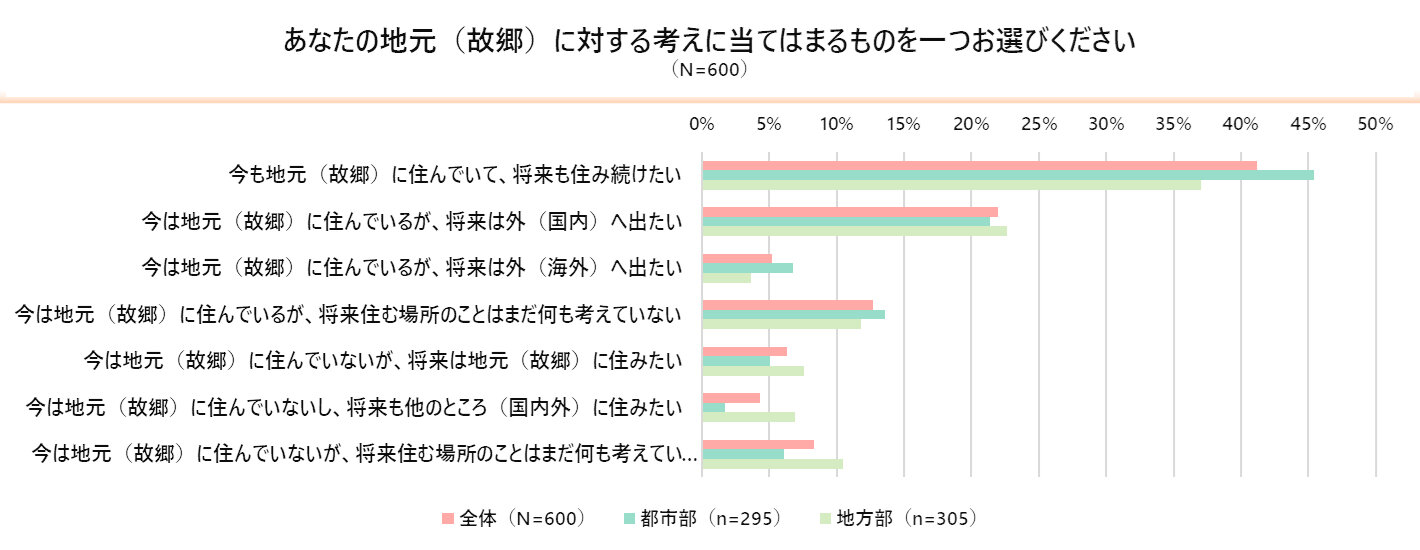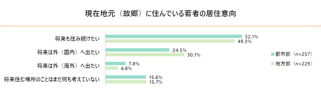 続いて、地元(故郷)に対する居住の考えを聞きました。最も多かった回答は「今も地元(故郷)に住んでいて、将来も住み続けたい」で41.2%となり、また「今は地元(故郷)に住んでいないが、将来は地元(故郷)に住みたい」が6.3%と、若者の2人に1人が地元居住をしたいという思いがあることが分かりました。また、現在の居住地域が「都市部」「地方部」のいずれかで選択してもらった結果をもとに比較をすると、都市部および地方部に住んでいる若者の8割がいまも地元に住んでいて、都市部・地方部ともに5割の若者が引き続き地元に住みたいという意向があることが分かりました。