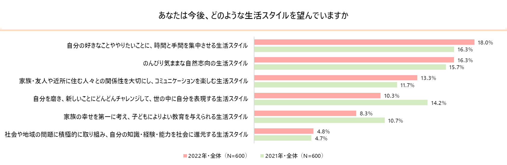 続いて、今後、どのような生活スタイルを望んでいるのかを聞いたところ、最も多かった回答は「自分の好きなことや興味のあることに囲まれた豊かで楽な生活スタイル」(28.8%)となりました。続いて「自分の好きなことややりたいことに、時間と手間を集中させる生活スタイル」(18.0%)、「のんびり気ままな自然志向の生活スタイル」(16.3%)となり、若者世代には、自分の好きなことを中心に置いた生活スタイルが好まれていることが分かりました。なお、「自分を磨き、新しいことにどんどんチャレンジして、世の中に自分を表現する生活スタイル」は昨年よりも3.8ポイント減少、また「家族の幸せを第一に考え、子どもによりよい教育を与えられる生活スタイル」も2.3ポイント減少しました。