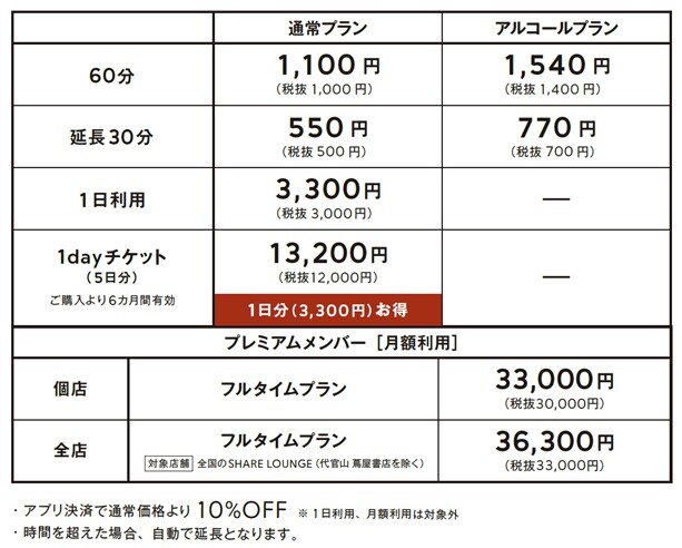 <SHARE LOUNGE利用料金>