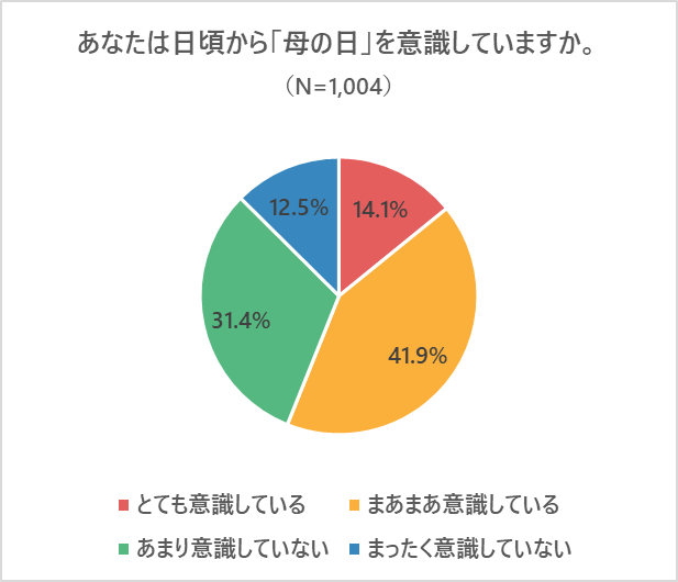 まず、「母の日」に対する意識を聞いたところ、「とても意識している」「まあまあ意識している」の合計は56.1%となり、母親の2人に1人は日ごろから「母の日」を意識していることが分かりました。特に年齢が下がるほどその意識傾向は高まり、「とても意識している」「まあまあ意識している」と回答をした20代は62.9%、一方の60代は44.5%と年齢間で18.3ポイントの差となり、回答者自身が母親であることへの意識に加えて、自分の母親に対する意識も見てとれる結果となりました。