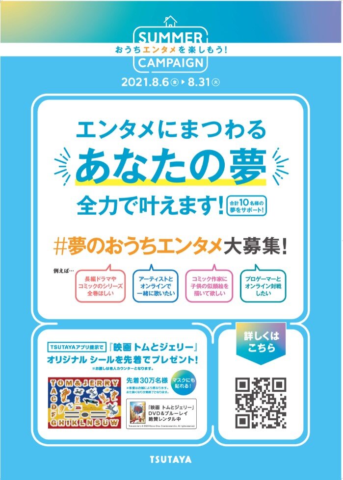 カルチュア・コンビニエンス・クラブ株式会社 蔦屋書店カンパニー(以下、TSUTAYA)は、8月6日(金)から31日(火)までの期間、TSUTAYAアプリのリニューアルを記念して「#夢のおうちエンタメ」プレゼントキャンペーンを開催いたします。また、同期間に店頭でTSUTAYAアプリ提示の上、ご希望の方に『映画 トムとジェリー』オリジナルシールを先着で30万名様にプレゼントいたします。さらには、お会計時のTポイントがいつでも2倍(通常ポイント1倍+期間限定Tポイント1倍 )になるアプリクーポンを8月5日(木)より配信開始いたします。