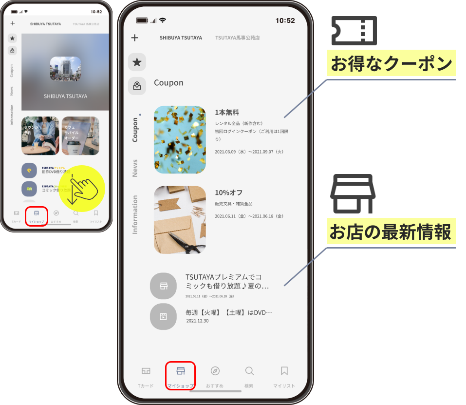 TSUTAYAアプリをダウンロードいただき、ログインし、ご利用の店舗をマイショップに登録いただくと、お会計時にTポイントが2倍になるクーポンがいつでも表示されます。