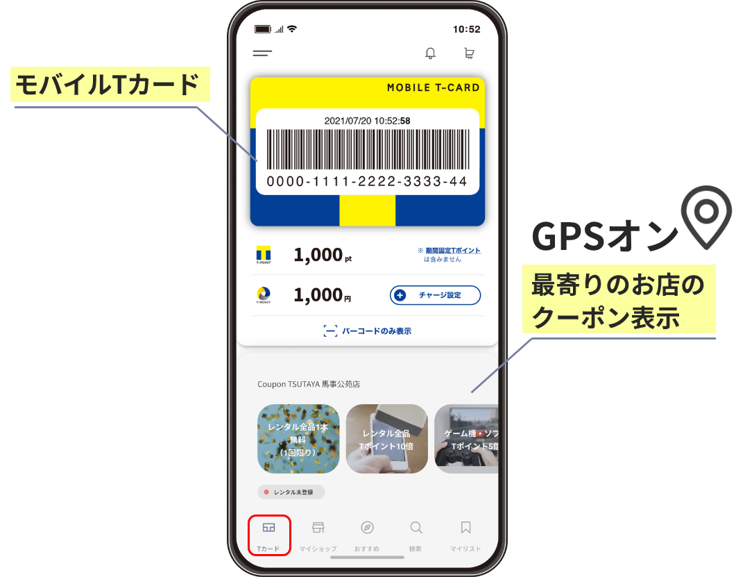 「Tカード」画面に、モバイルTカードとクーポンが表示されるようになります。この画面のクーポンは、現在位置の最寄り店舗のクーポンを表示※します。