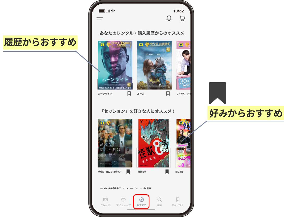 ※ログインしているアプリを利用しているお客様が対象となります。ログインされずにご利用いただいているお客様に関しては、TSUTAYAのイチオシ作品を中心におすすめします。