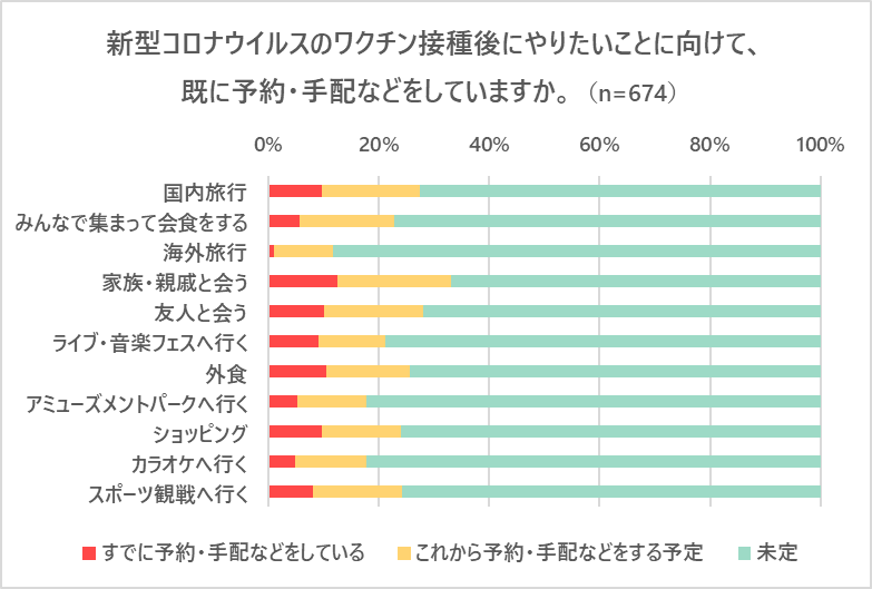 続いて、ワクチン接種後にやりたいことに向けて、すでに予約・手配などをしているか、また実際にいつ頃実現したいかをそれぞれ聞きました。まず1位の「国内旅行」では、「すでに予約・手配などをしている」人は9.8%、「これから予約・手配などをする予定」人は17.7%、また実現したい時期として1番多かったのは「2021年秋冬」で42.9%となりました。続いて「みんなで集まって会食をする」では、「すでに予約・手配などをしている」人は5.7%、「これから予約・手配などをする予定」人は17.1%、実現したい時期は「2021年秋冬」が50.8%となり、「海外旅行」については、「すでに予約・手配などをしている」人は1.1%、「これから予約・手配などをする予定」人は10.5%、実現したい時期は「2022年秋以降」が41.7%となりました。会食などすぐに手配できるものや実現時期がかなり先の海外旅行については、予約や手配予定をしている人はまだまだ少ないことが分かりました。