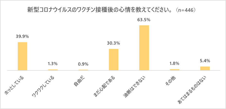 最後に、ワクチンを1回以上接種済みの446名に、ワクチン接種後の心情についてを聞いたところ、最も多かった回答の上位から「油断はできない」(63.5%)、「ホッとしている」(39.9%)、「まだ心配である」(30.3%)が選ばれ、「自由だ」「ワクワクしている」との選択肢を選んだ人は1%とかなり低い結果となりました。ここ最近は変異株が爆発的に増えており、ワクチンを接種したとしても、まだまだポジティブな心情を持てる状況ではないことが見てとれました。