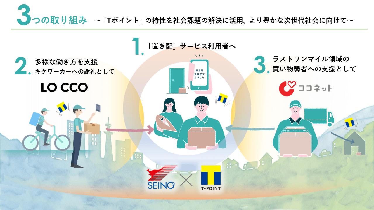 1. セイノーHD子会社の株式会社LOCCOと共に配送に関わる社会課題解決のための「置き配」推奨として「置き配」サービスを利用し、Tポイント利用手続きを行ったお客さまへTポイント付与