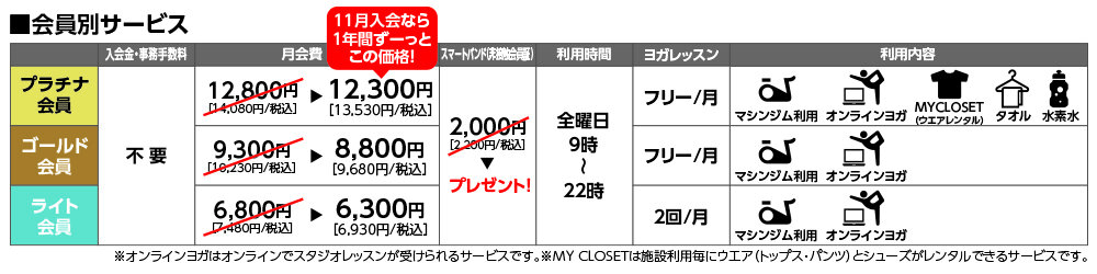・11月入会:月会費550円割引/月(1年間で6,600円お得)