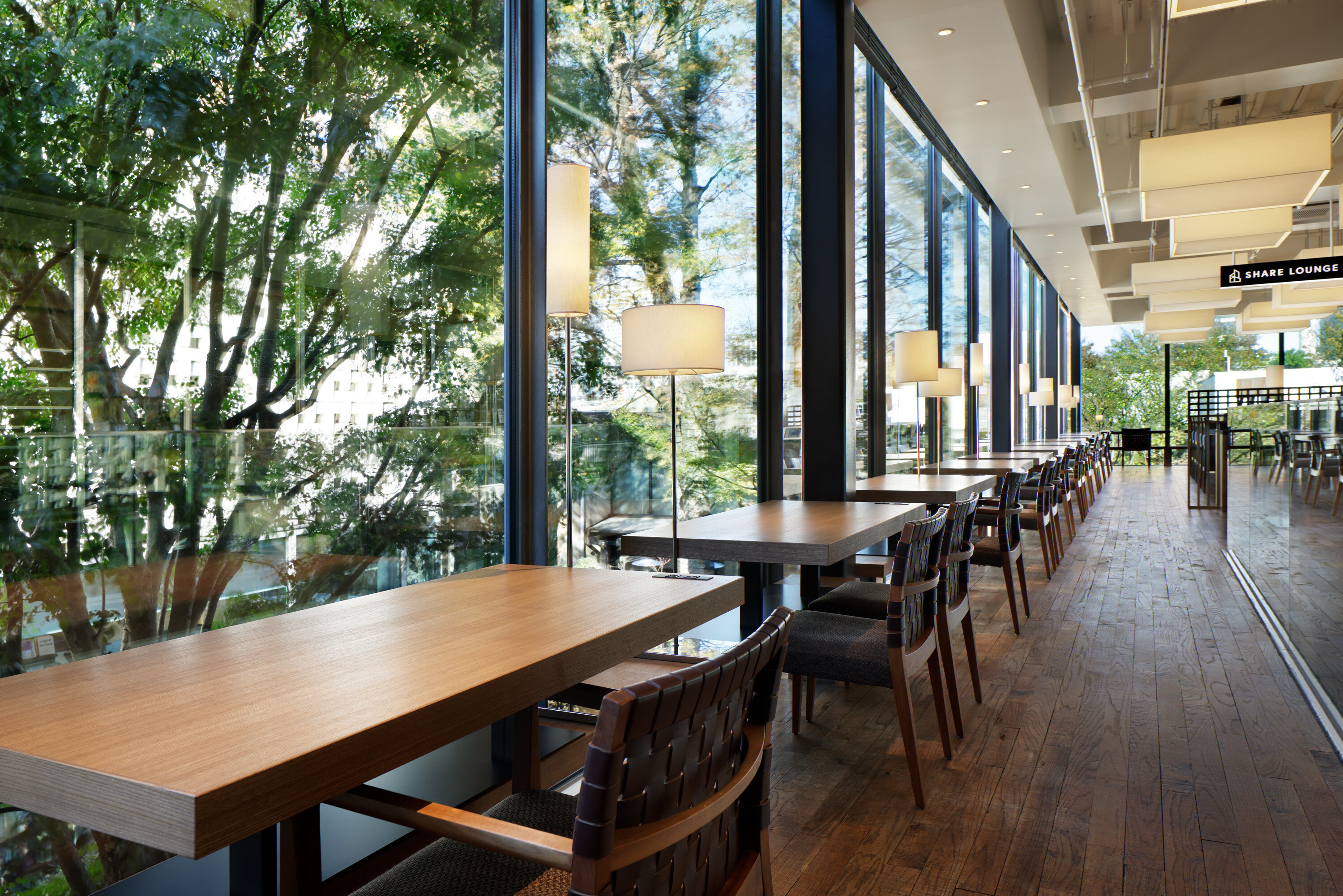 四方の大きな窓からは代官山 蔦屋書店のある代官山T-SITEの木々や旧山手通りを眺められます。陽光のたっぷりと入る開放的なフロアすべてをSHARE LOUNGEにリニューアルいたしました。