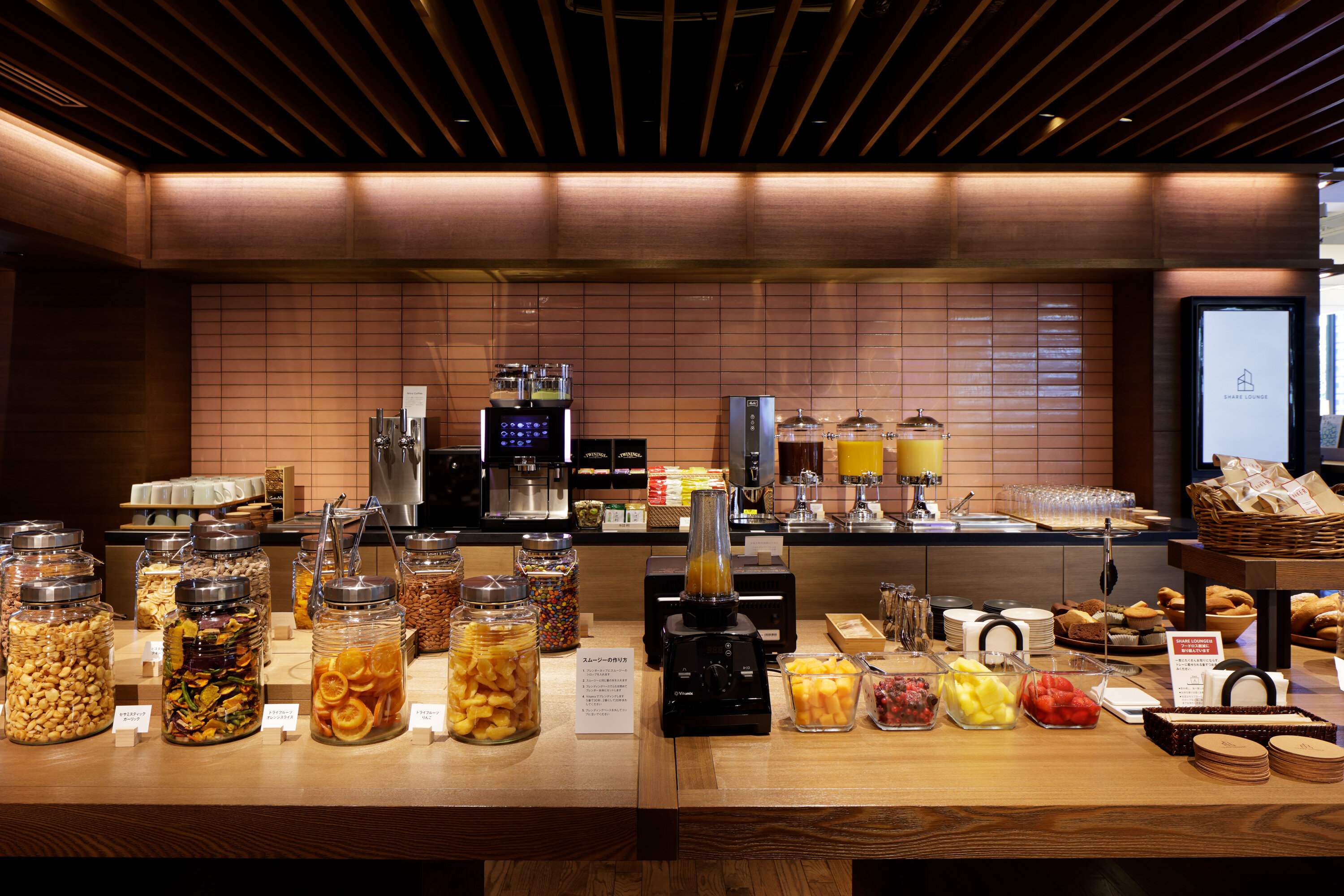 ご自身でおつくりいただけるスムージーをはじめとした17種のジュースやコーヒーなど全25種のドリンク、代官山で評判の高いベーカリーのパンや21種のスナックをお好きなだけお楽しみいただけます。スパークリングワイン、クラフトビールなどアルコールもご用意しています。