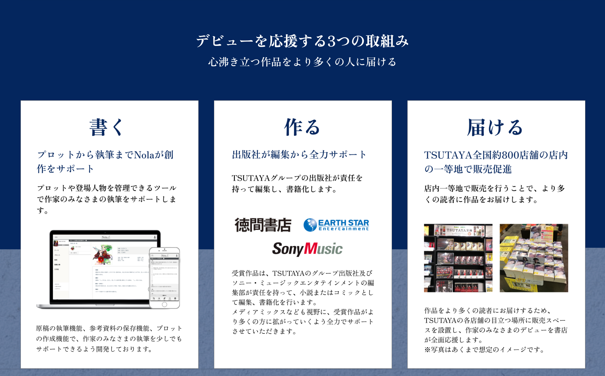 作家のみなさまの執筆環境~全国販売までを総合的に支援する取組みとして、創作段階においては「Nola」を使用することで、「起承転結」などのプロット形成、章ごとの原稿整理、登場人物や世界観の設定まで、軸のぶれない・深みのある物語の創出を執筆できる環境を提供いたします。また、大賞を受賞した作品には賞金が授与されるほか、TSUTAYAのグループ出版社である徳間書店とアース・スター エンターテイメントにより書籍化および出版が確約されます。加えて、全国約800店舗のTSUTAYAの書籍・コミック売場の一等地にて、大々的に展開を行ってまいります。