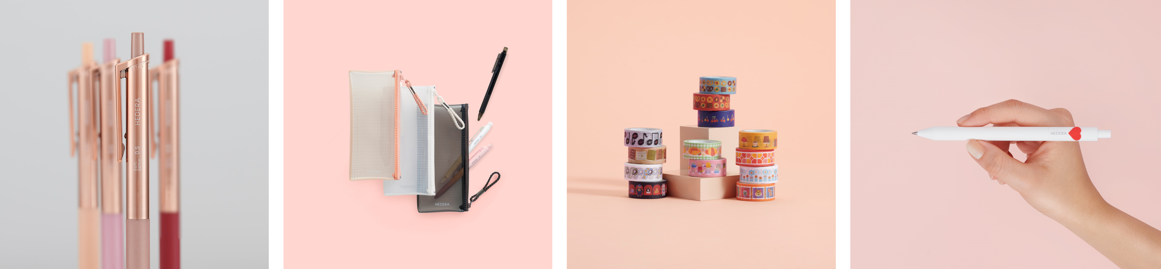 オリジナルブランド『HEDERA』は、2017年10月に、『大人の女性』に向けてシャープで機能的なデザインを特徴とした、ステープラーやハサミなどを取りそろえた文具ブランドとしてスタートしました。その後、「学生にもHEDERAを」として、ノート・ルーズリーフなどより実用性の高さを重視したアイテムや、「大人の女性の手元を美しく魅せる」をコンセプトとした筆記具を展開するなど、毎年文房具のラインナップを拡充し続けています。