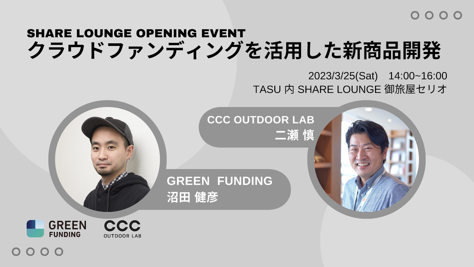 GREEN FUNDINGの代表取締役CEO 沼田健彦氏、CCC OUTDOOR LAB ラボ長 二瀬慎氏を迎え、クラウドファンディングを活用したアウトドア新商品開発の事例をもとに、トレンドからどのように商品を開発し、市場に送り出していくのか、最先端のマーケティング事例も交えて、ご紹介いたします。