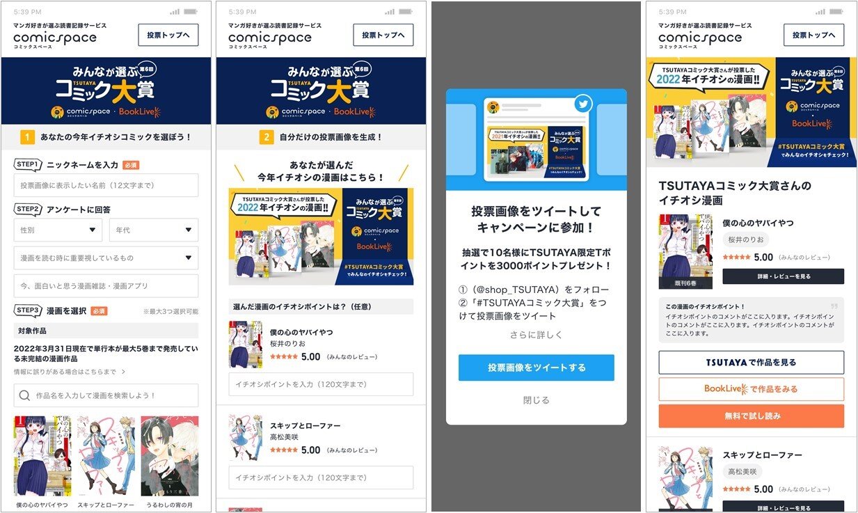 ・TSUTAYA限定Tポイントプレゼントキャンペーン...「comicspace」内特設ページで投票後、表示された画像を「#TSUTAYAコミック大賞」を付けてtwitterに投稿していただいた方の中から抽選で10名様にTSUTAYA限定Tポイント3,000ポイントをプレゼントいたします。ご当選された方には、投票期間終了後、当選した方のTwitterアカウントへDMを送らせていただきます。