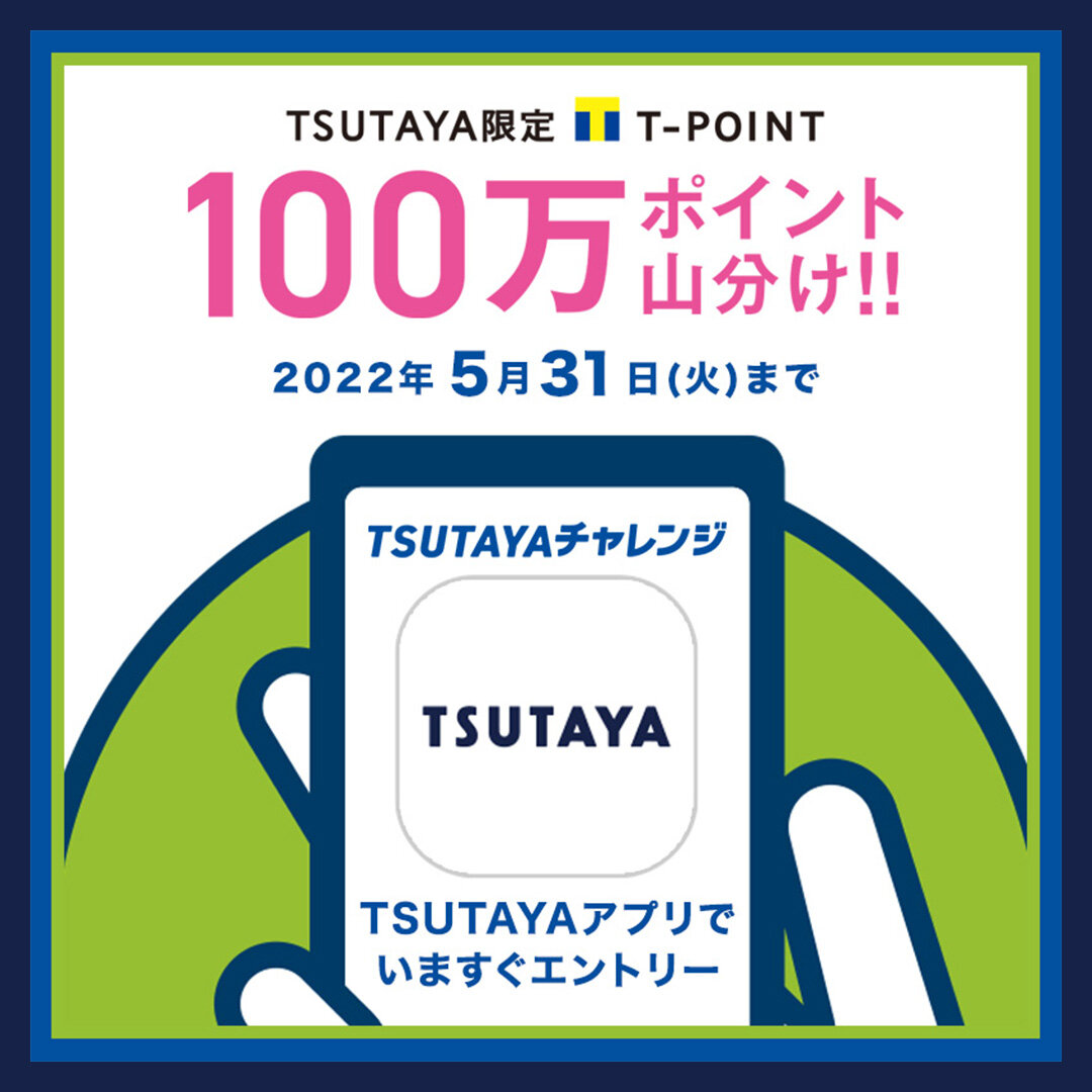 TSUTAYA店舗で、有効なTカード(モバイルTカード含む)をご提示の上、一会計770円(税込)以上のご利用を一口とし、TSUTAYAアプリからエントリーいただくと、応募口数に応じてTSUTAYA限定Tポイント100万ポイント(※)を山分けしてプレゼントいたします。