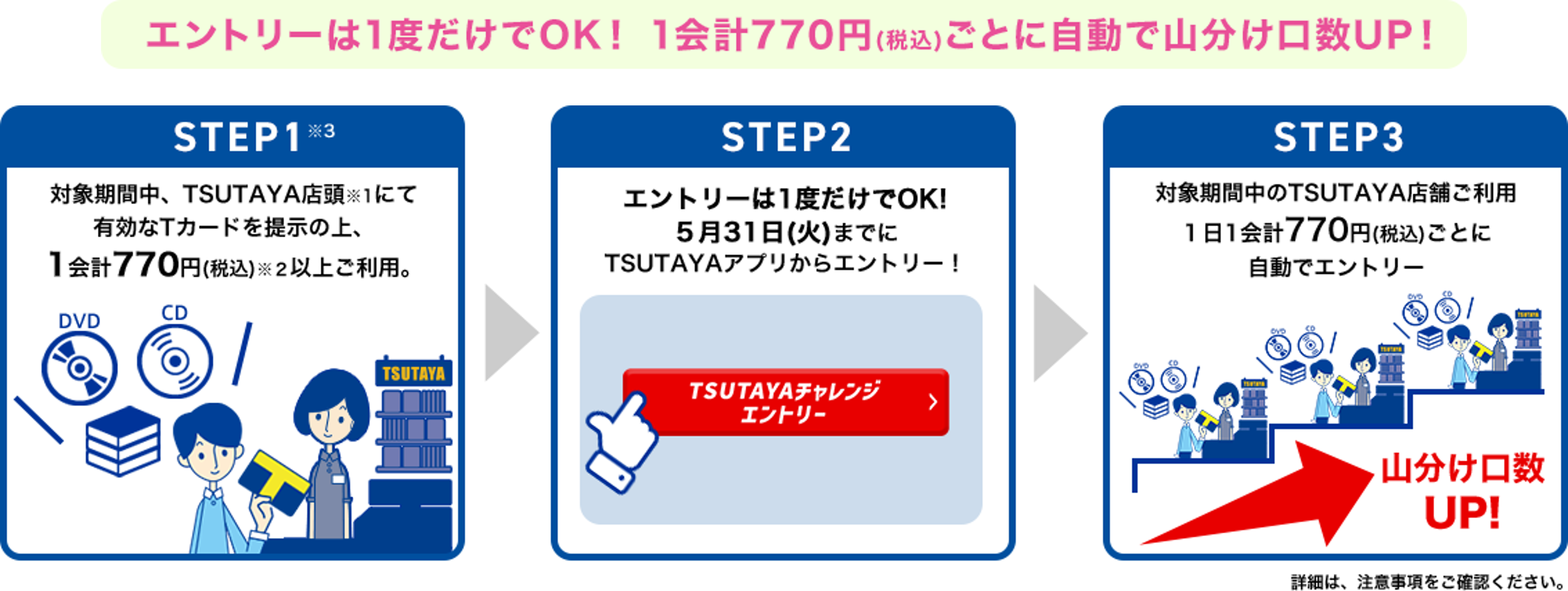 ※一度TSUTAYAアプリからエントリーいただくと、770円(税込)以上のご利用を一口に、自動でエントリーされ、山分け口数が増えていきます。