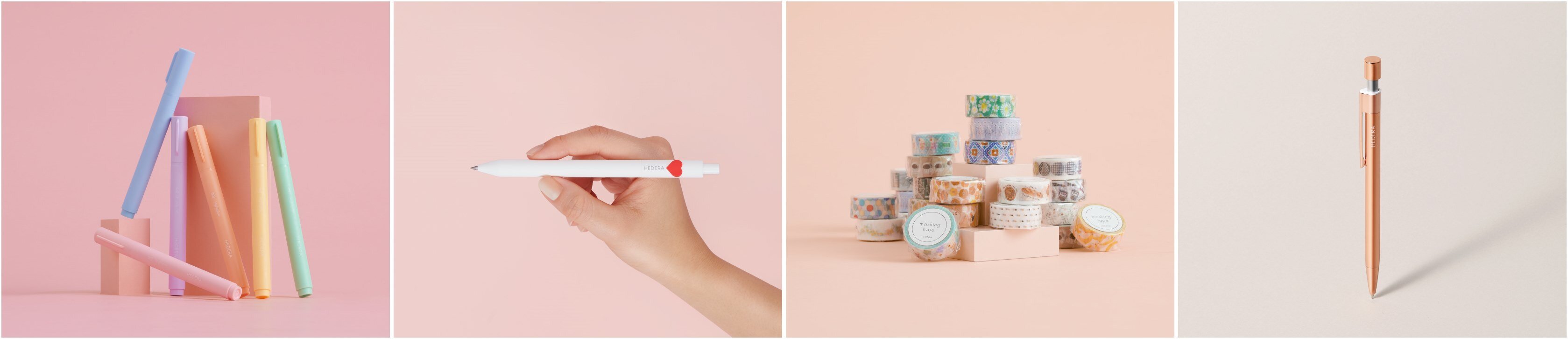 2017年10月に、『大人の女性』に向けてシャープで機能的なデザインを特徴とした、ステープラーやハサミなどをリリースしてスタートしました。その後、2018年には「学生にもHEDERAを」として、ノート、ルーズリーフなど、より実用性の高さを重視したアイテムをリリースし、2019年には「大人の女性の手元を美しく魅せる」をコンセプトとした筆記具をメインに揃え、2020年、2021年には、人気の筆記具の新色・新型や大容量の蛍光ペンやマスキングテープの新柄がラインナップに加わりました。