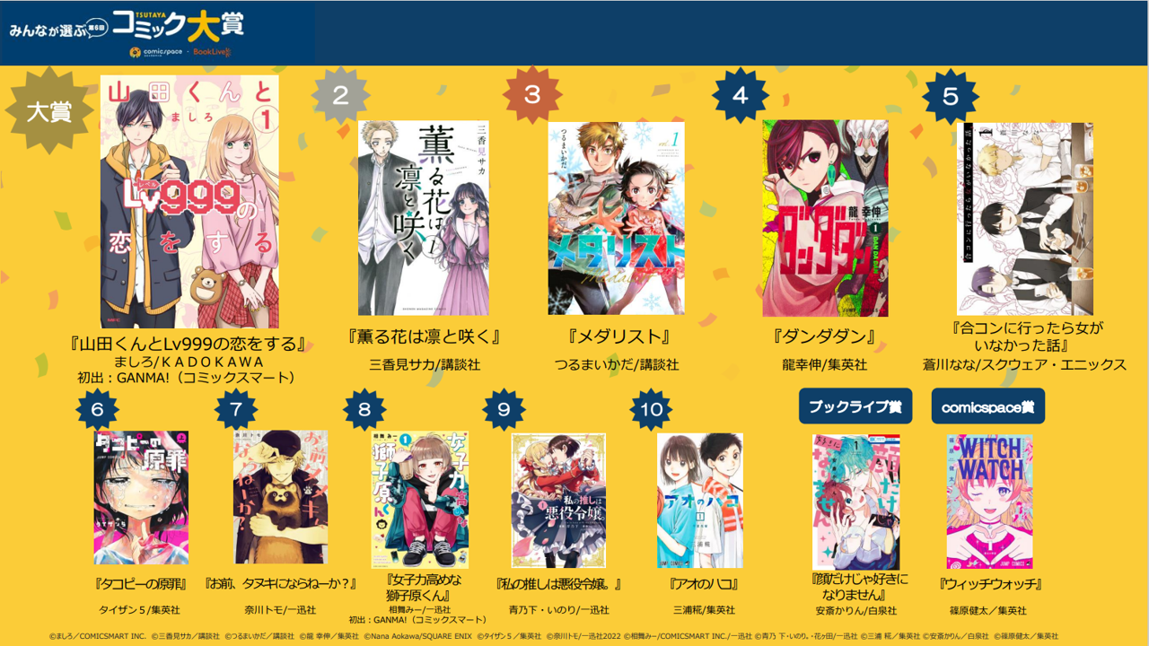 「第6回 みんなが選ぶTSUTAYAコミック大賞」 2022年イチオシコミック、大賞は『山田くんとLv999の恋をする』に決定!