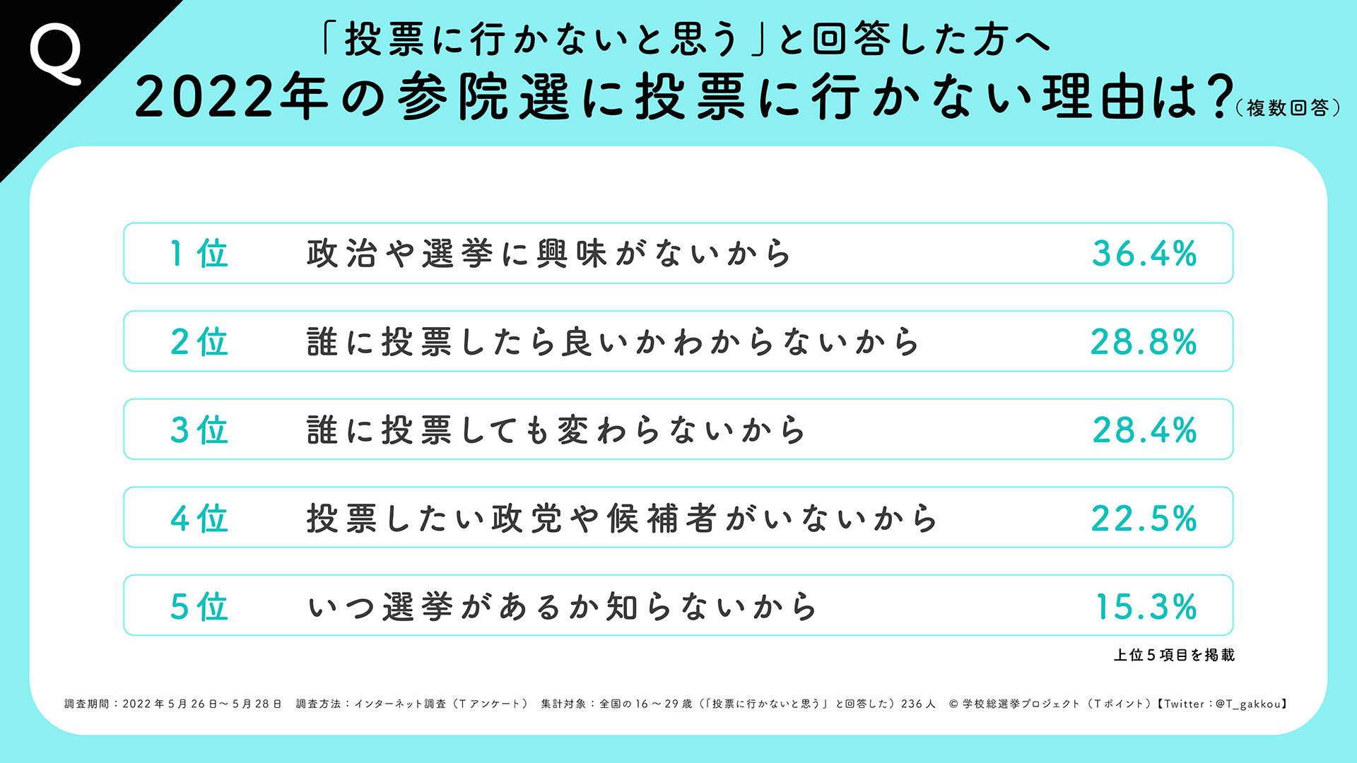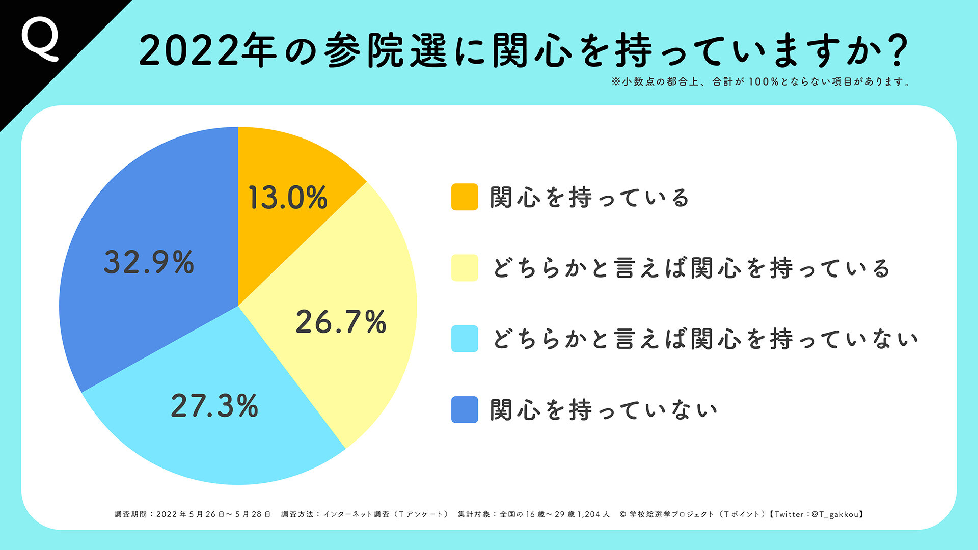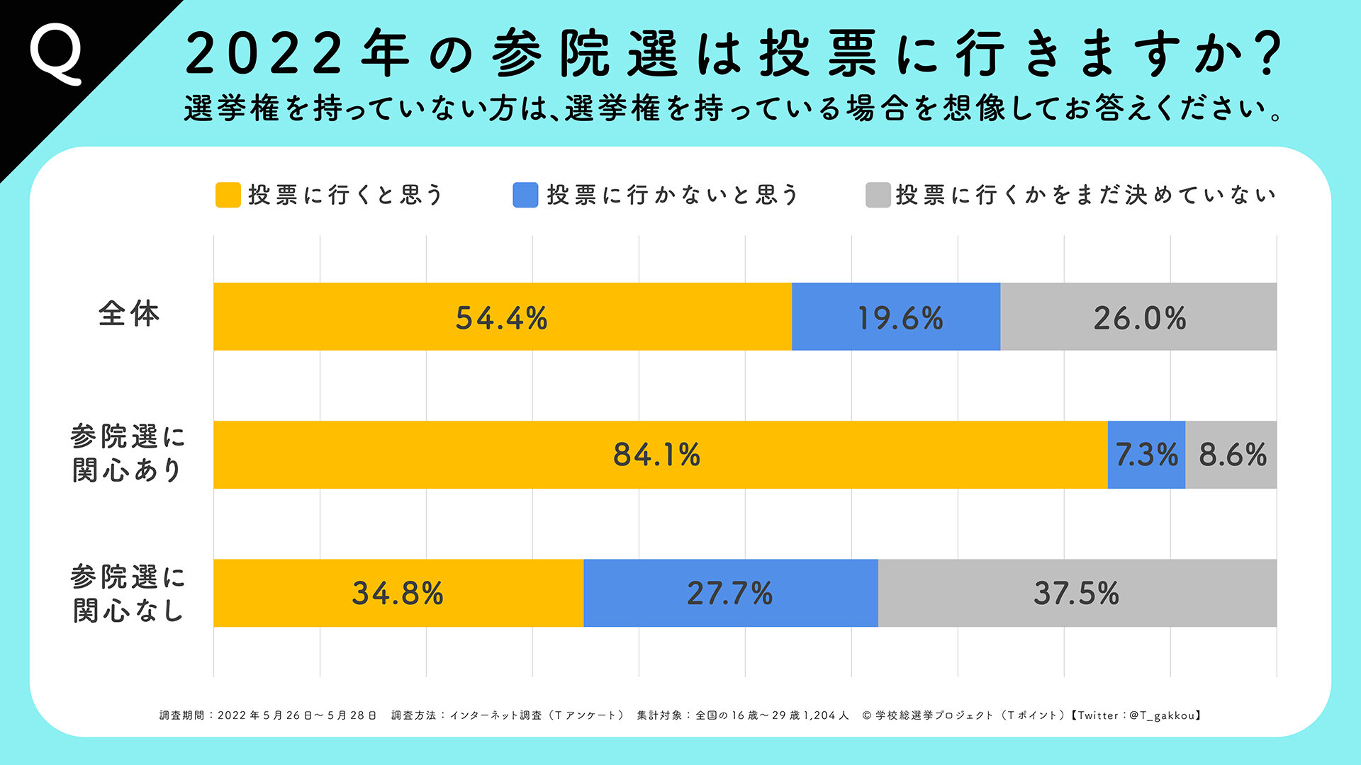 このたび「学校総選挙プロジェクト」では、本日公示が開始され、7月10日が投票日となる「第26回参議院議員選挙」に向けて、2022年5月26日(木)~5月28日(土)までの間、オンライン調査によって16歳~29歳までの若者世代に対して「2022年度若者の政治意識調査」を実施いたしましたので、その結果をお知らせいたします。