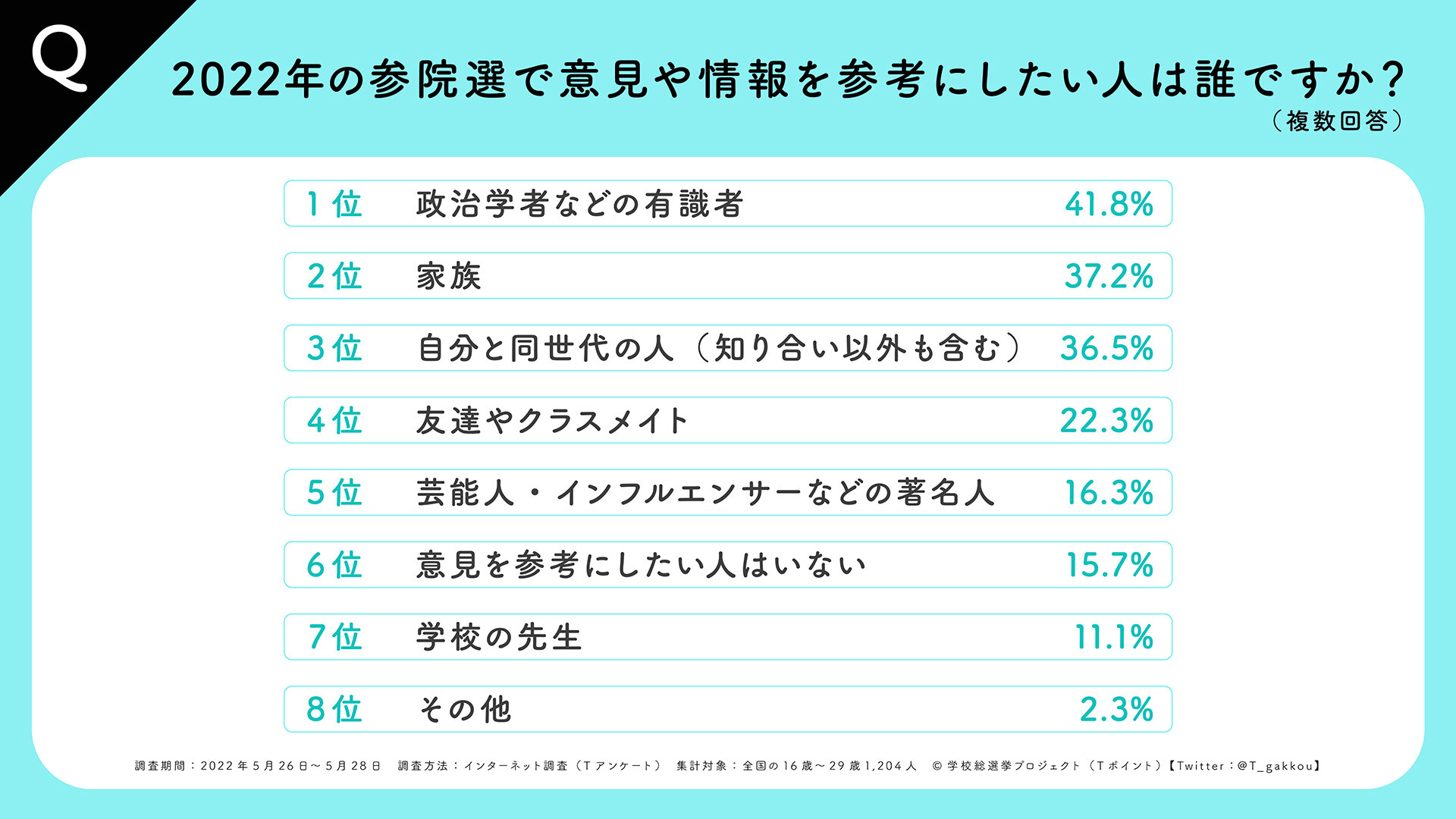 2022参院選の投票日まであと17日。最後に、今夏の参議院議員選挙が近づいたら、意見や情報を参考にしたいと思う人が誰であるかを複数選択で聞きました。参院選に関心があると回答をした人に絞って見てみると、回答数が多かった上位から「政治学者などの有識者」で41.8%、「家族」で37.2%、「自分と同世代の人」で36.5%となり、政治学者などの有識者の意見だけでなく、家族や同世代の意見も取り入れたいニーズがあることが分かる結果となりました。ことが分かる結果となりました。