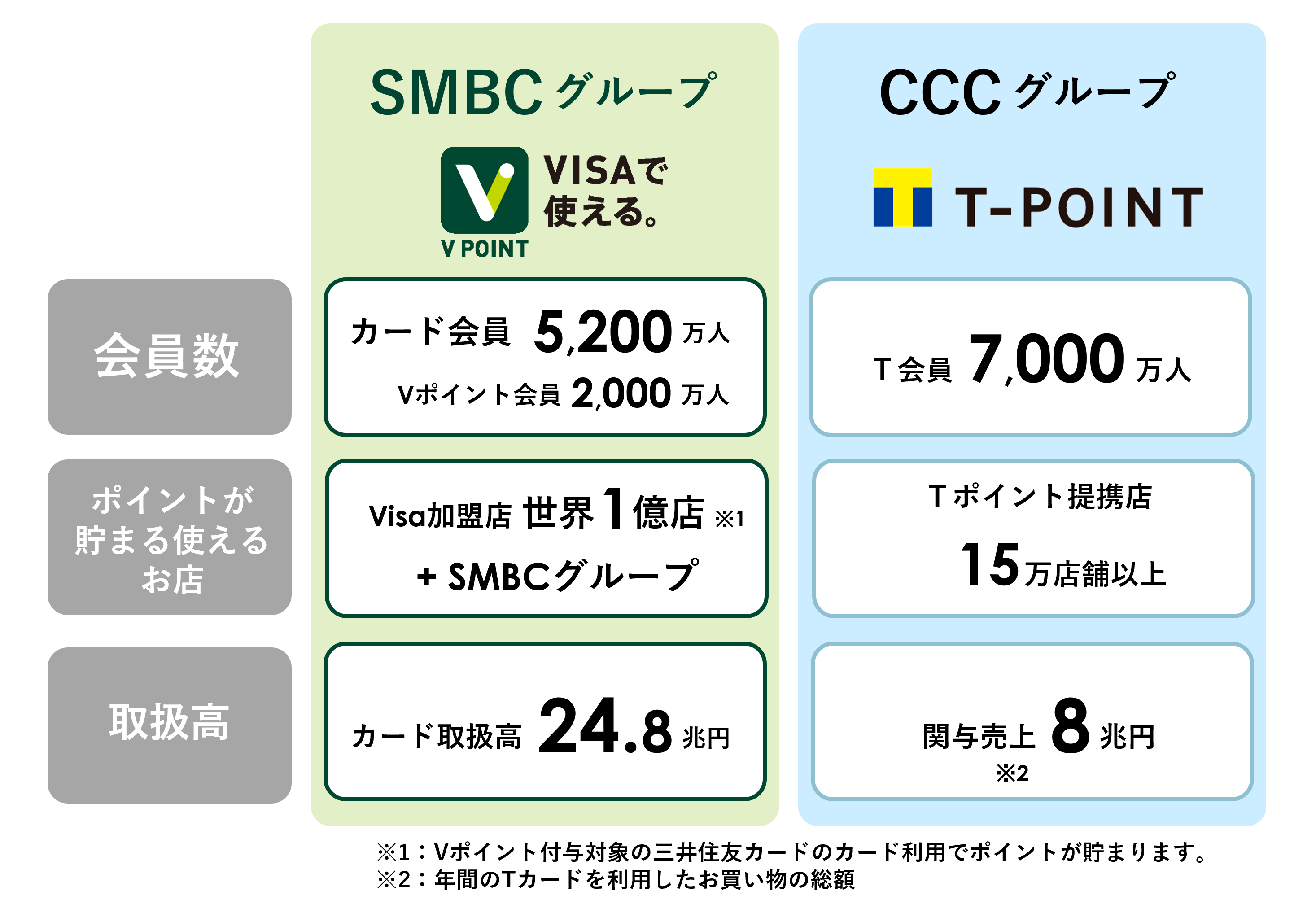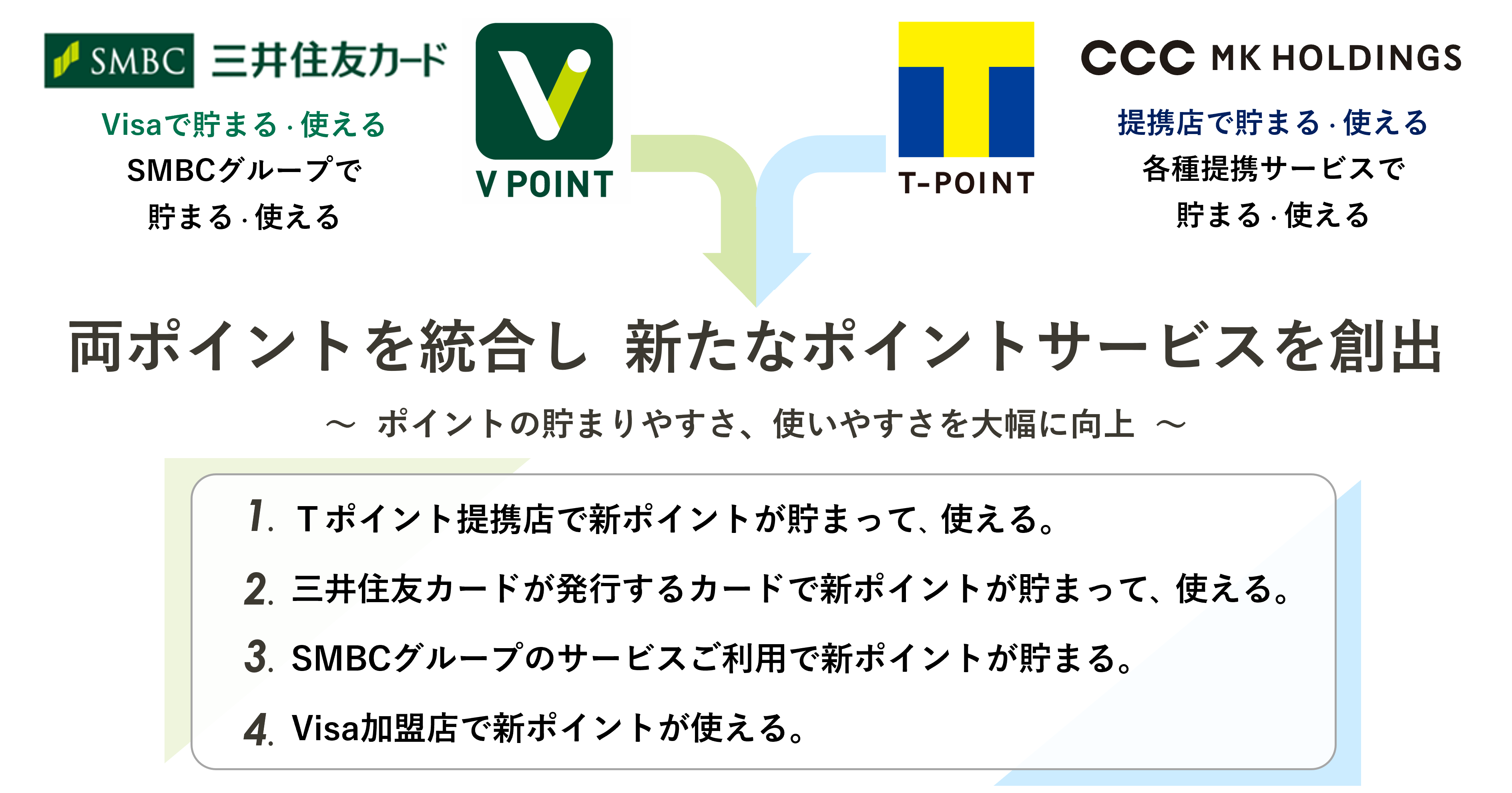 業務提携においては、三井住友カードとCCCMKHDのポイント事業を統合し、VポイントとTポイントを統合した新たなポイントブランドを創出すべく協議していきます。