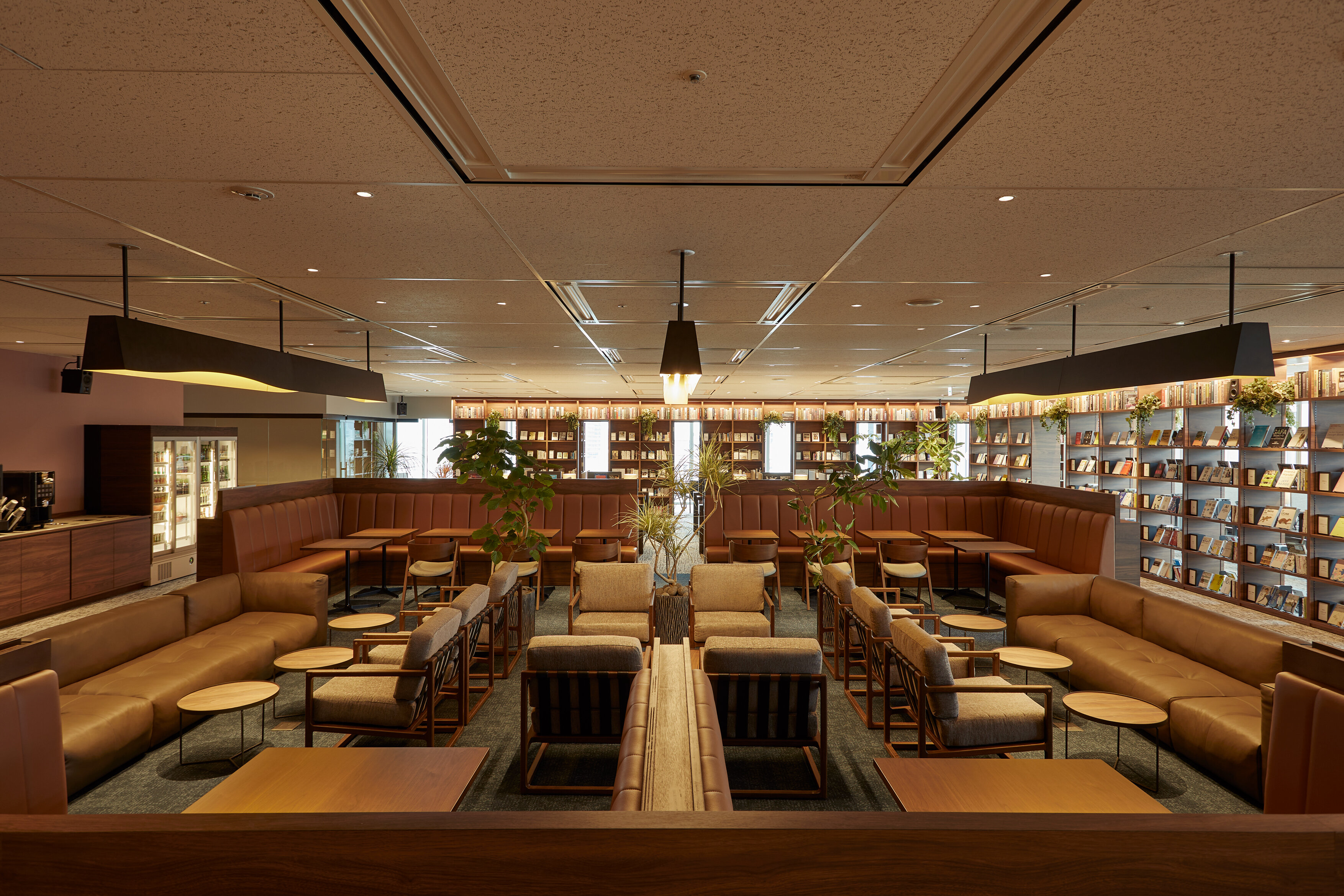 こだわりの家具で彩ったラウンジのような居心地の良い空間に、フリードリンク&ナッツや超高速Wi-Fi、ディスプレイの貸し出し等、充実したアメニティを備えています。