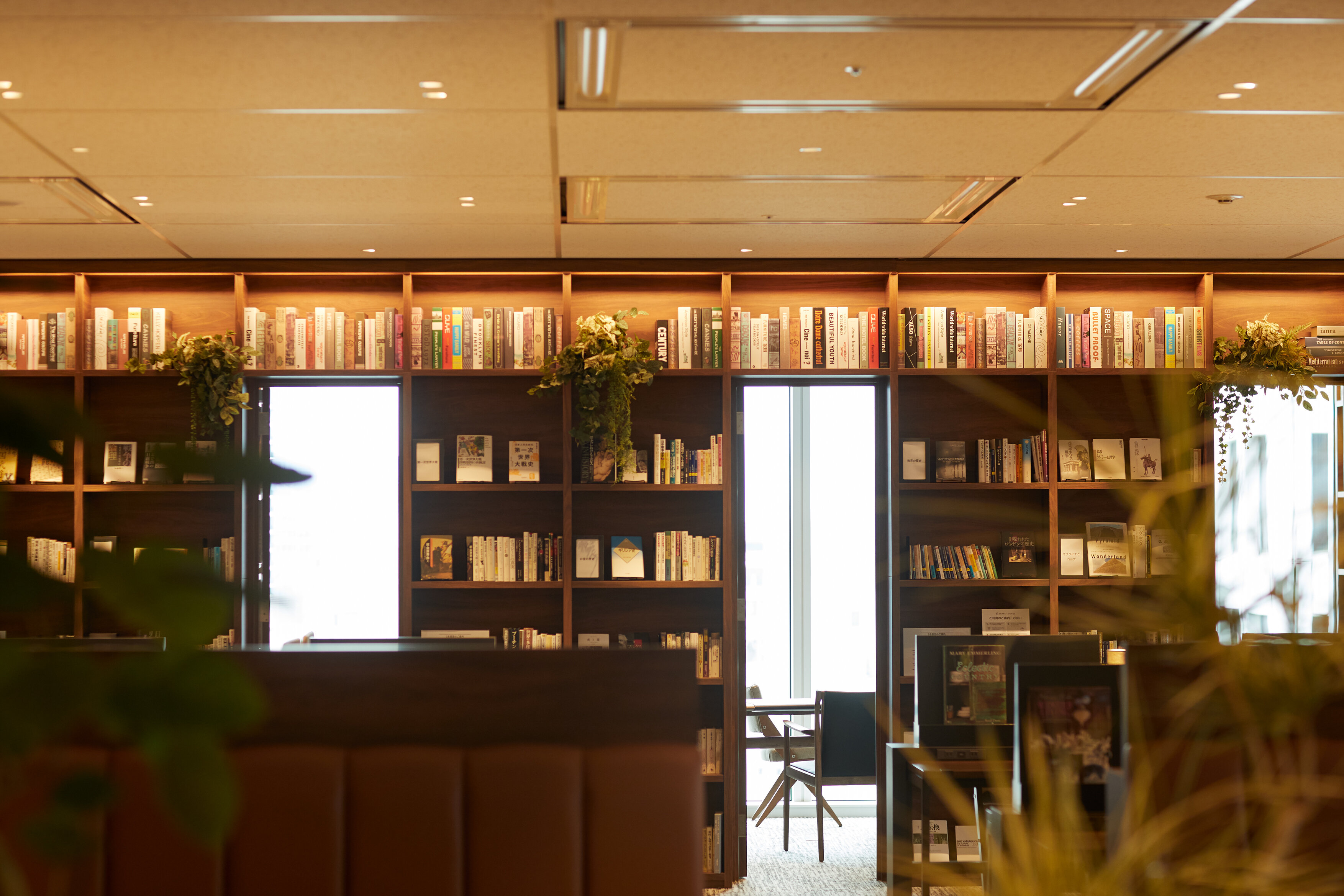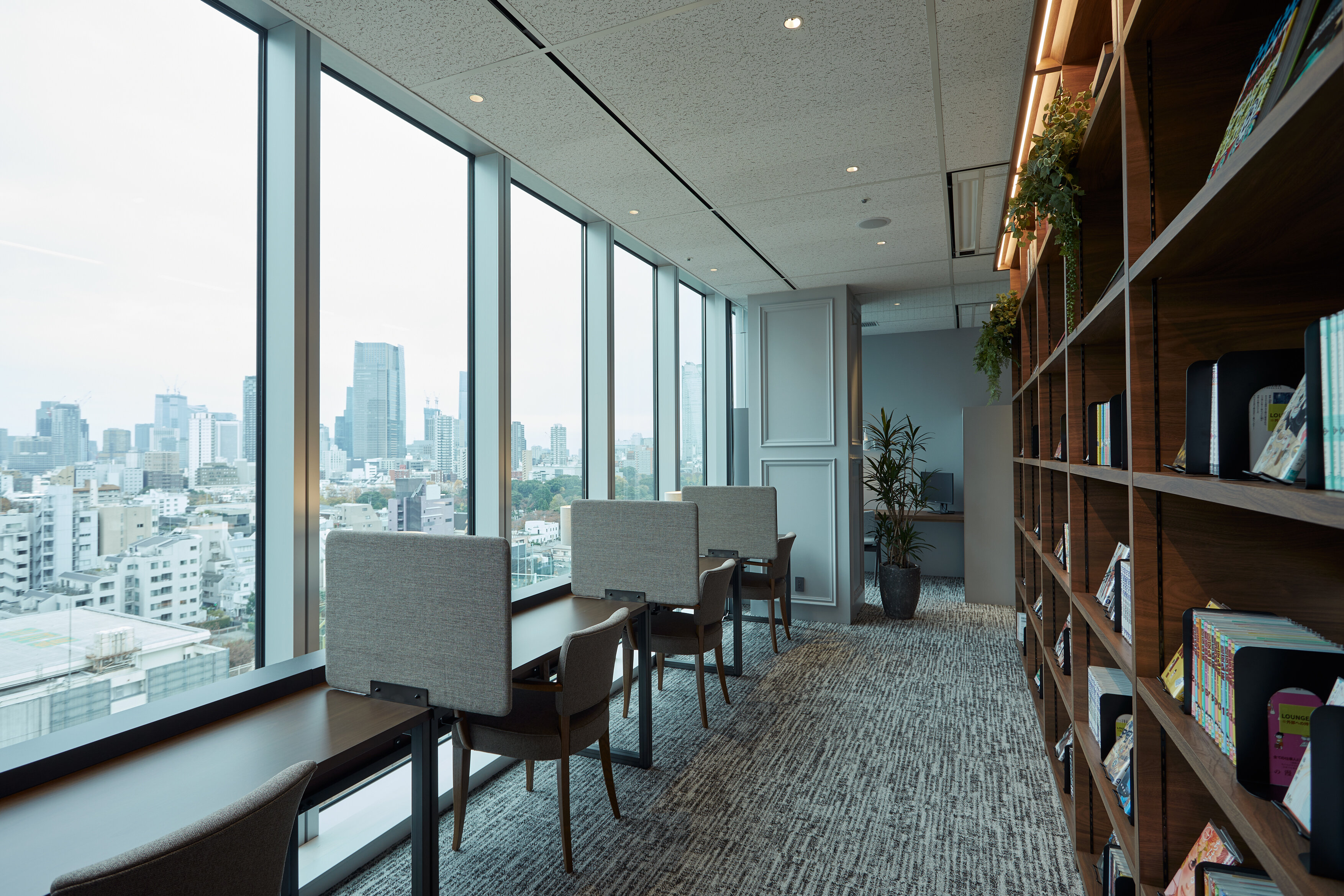 本に囲まれたリッチで落ち着いた占有空間で、広々とした自分だけのデスクで、仕事や読書に集中することができます。一部個室では、自分のスマートフォンから好きな音楽を流して楽しむこともできます。