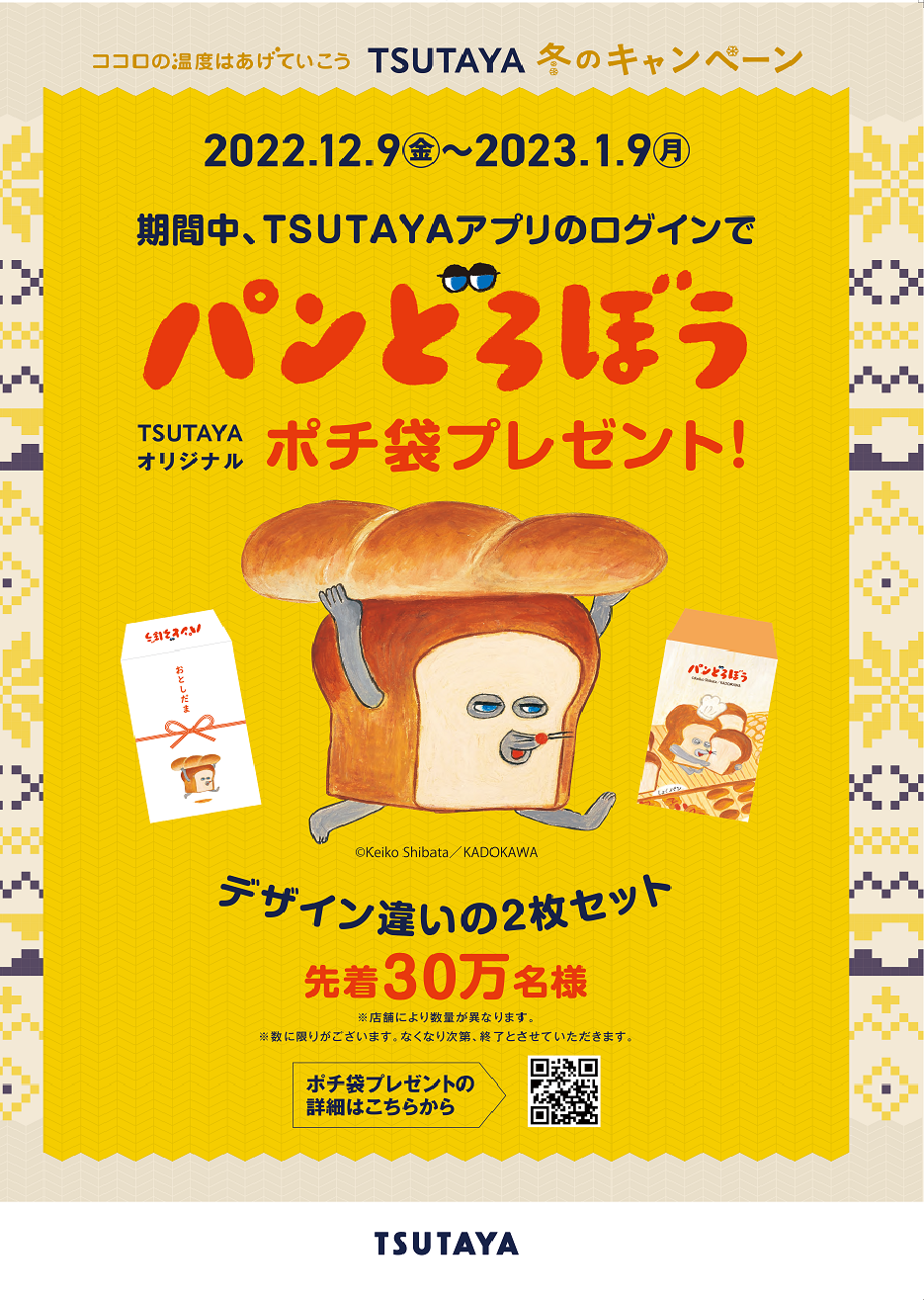 "ココロ"がほっこり温まる、イラストレーター・絵本作家の柴田ケイコによる大人気絵本シリーズ『パンどろぼう』のポチ袋を「TSUTAYAアプリ」にログインすると表示される「引換券」をTSUTAYA店頭で提示いただくと先着で30万名様に『パンどろぼう』のポチ袋をプレゼントいたします。
