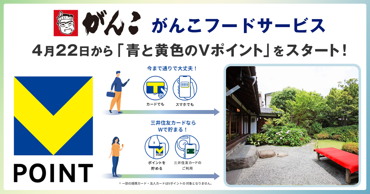 がんこフードサービス株式会社(本社:大阪府大阪市、代表取締役社長:小嶋達典、以下「がんこフードサービス」)とCCCMKホールディングス株式会社(本社:東京都渋谷区、代表取締役社長 兼 CEO:髙橋誉則、以下「CCCMKHD」)、三井住友カード株式会社(本社:東京都江東区、代表取締役社長:大西幸彦、以下「三井住友カード」)は、がんこフードサービスが運営する外食レストラン「がんこ」にて2024年4月22日(月)より順次、「青と黄色のVポイント」が貯まって使えるサービスを開始いたします。