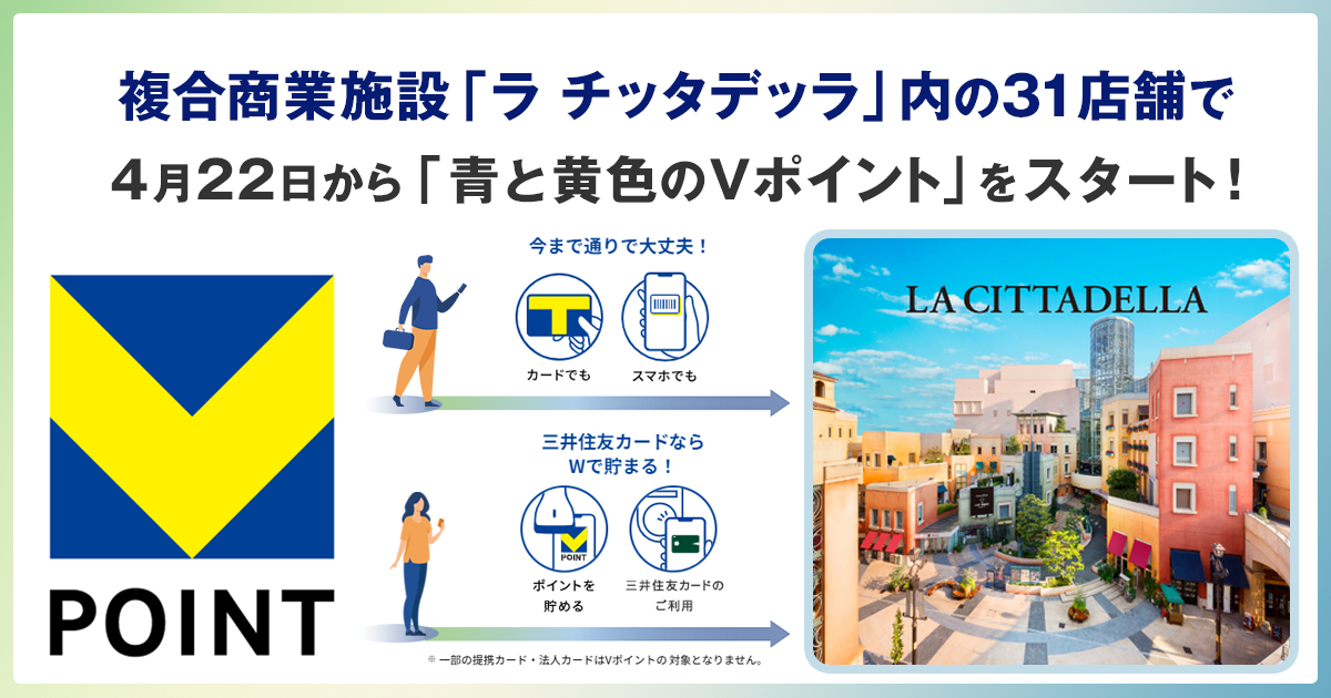 このたびの取り組みにより、「ラ チッタデッラ」内の31店舗(※別紙参照)をご利用のお客さまは、店頭でのお会計時に、「青と黄色のVポイント」が貯まるカードを提示すると、ショッピングポイントとして「青と黄色のVポイント」が200円で1ポイント貯まります。さらに三井住友カード※でお支払いすると、決済ポイントとして「青と黄色のVポイント」が併せて貯まります。