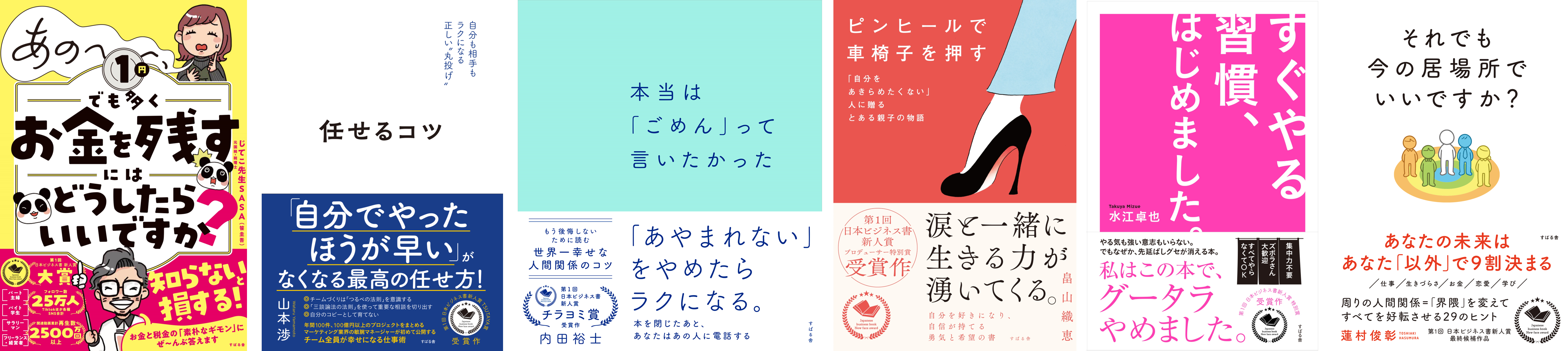 本賞は、CCC、すばる舎が共催し、bizplayが協賛する「在野に眠る未来のベストセラー『ビジネス書』著者を発掘する」ことを目的とした公募プロジェクトです。記念すべき第1回目において、「大賞」を受賞した『あの〜〜〜、1円でも多くお金を残すにはどうしたらいいですか?』(著/じてこ先生SASA(笹圭吾))に加え、「TSUTAYA賞」、「チラヨミ賞」、「プロデューサー特別賞」、「特別賞」、および最終候補作品より1作品の計6作品の発売が決定いたしました。