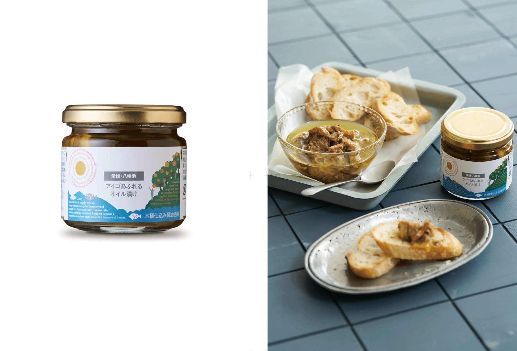 白身魚の中でも濃厚な旨味をもつアイゴは、火を入れてもかたくならないのでオイル漬けには最適。アイゴやみかんの皮、ナッツのおいしさが溶け込んだエキストラバージンオリーブオイルごと、たっぷりバゲットなどにのせてお召し上がりください。完成度の高さは、これまでアイゴが未利用魚とされてきたことに驚きを感じるほどで、オレンジワインなどの複雑な味わいにもよく合います。