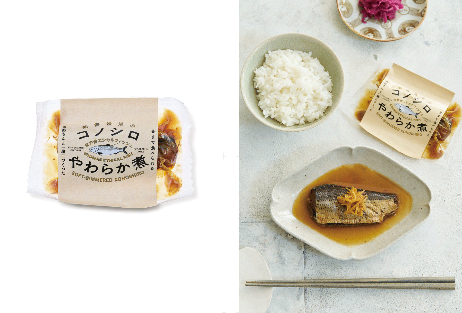 小骨があたるなどで利用が限定されていたコノシロを、船橋の漁師さんの協力と海光物産の下処理の技術、エスエスフードの骨まで食べられる加工技術、こだわりやの商品開発の経験によって、おいしくアップデートしました。