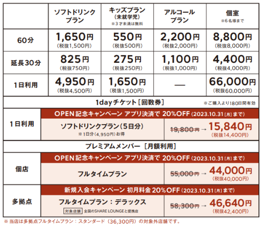■六本木 蔦屋書店 SHARE LOUNGE 料金表