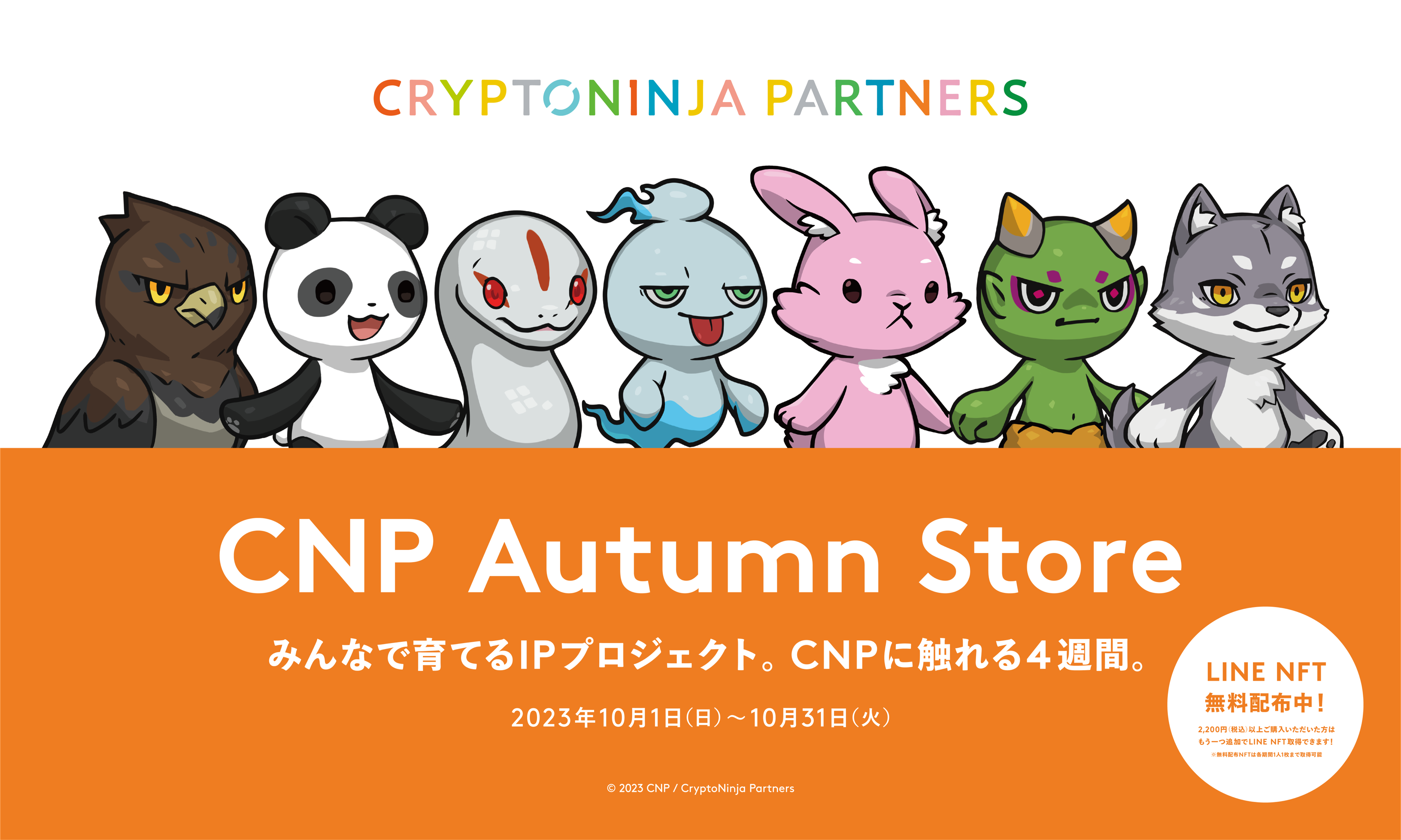 TSUTAYA・蔦屋書店でのNFT配布は今回が初めての試みとなり、日本最大級の売買取引総額であるNFT発IP「CNP」を通じて、お子さまから大人まで幅広い層のお客さまに「Web3時代にふさわしい新たなキャラクターとの体験」を提供いたします。CNPの世界を思う存分満喫できる期間限定ストア「CNP Autumn Store」をぜひお楽しみください。